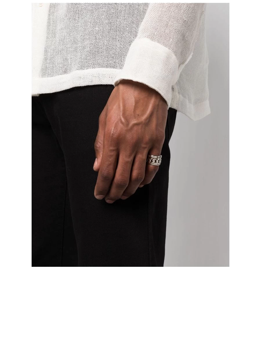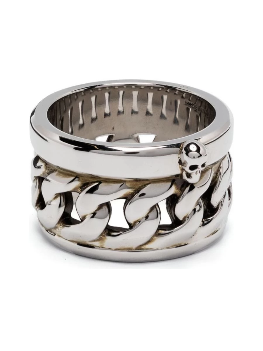 An on-trend addition to any outfit, this stylish chain-motif band ring is an emblem of craftsmanship. The polished finish alongside the signature skull charm epitomises the brand’s edgy aesthetic. This piece adds a touch of rebellious spirit to your day-to-day ensembles, crafted with care in Italy.