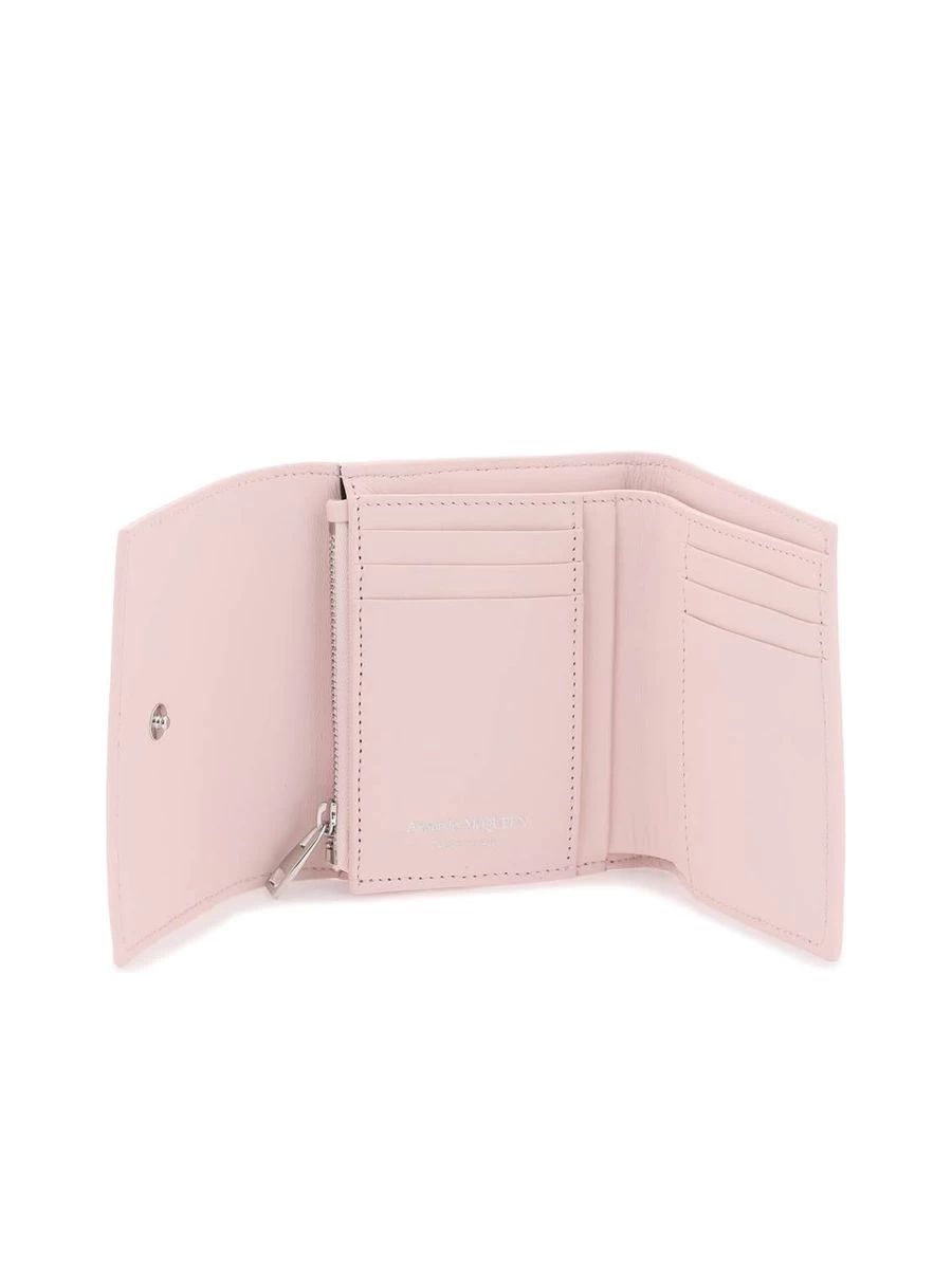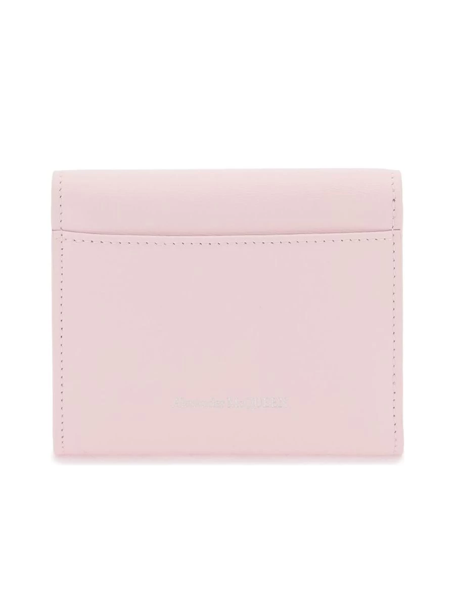 A chic and functional compact wallet by Alexander McQueen, highlighting an iconic skull emblem in silver metal on the flap for an edgy touch. The streamlined design features a practical interior arrangement, including a compartment for notes, a zip pocket for coins, and sufficient slots for cards and documents, ensuring everything stays neatly organized.