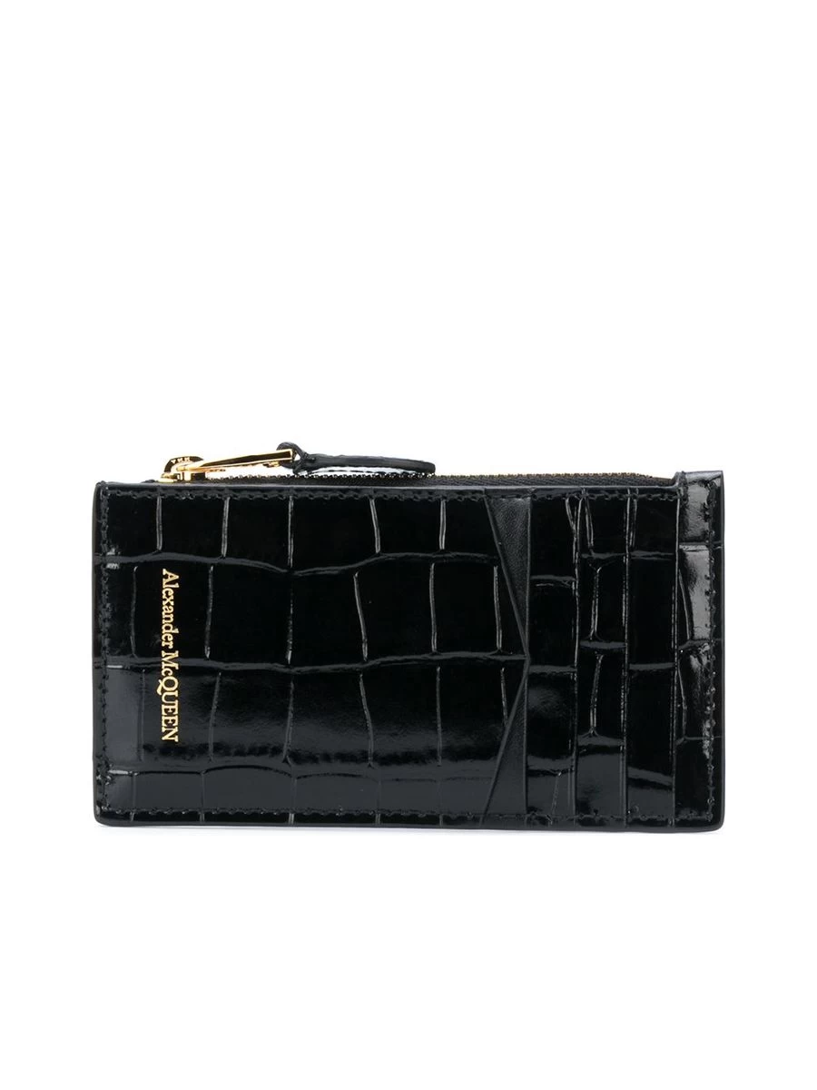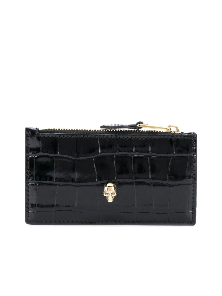 This chic flat zip purse features textured crocodile effect leather, presenting a bold skull stud detail that embodies the edgy spirit of the brand. Its compact form is finished with gleaming gold-tone accents, including sumptuous logo lettering, and is complemented by practical card slots for on-the-go organisation.