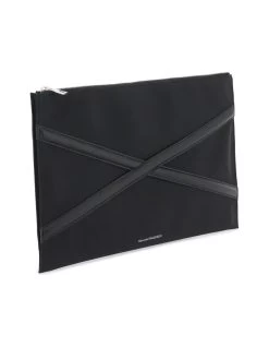 This sleek pouch features a durable nylon construction complemented by sophisticated leather harness detailing. Boasting a clean design, its zipper closure opens to reveal a contrasting lined interior equipped with three leather credit card slots and nifty silver-finished hardware. Its functionality makes it a stylish companion for the contemporary man about town.