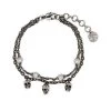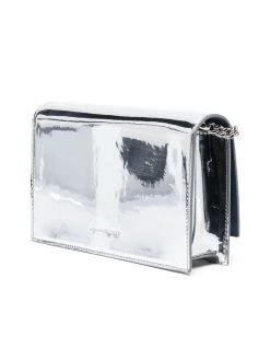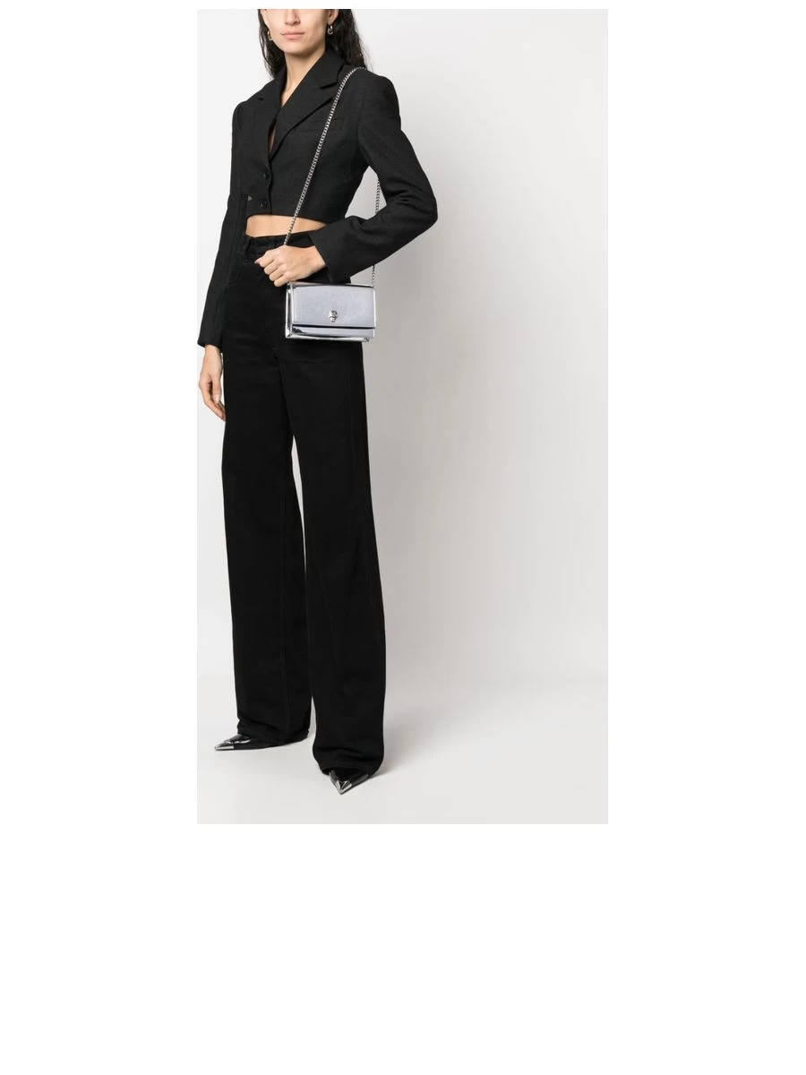 Exude edgy elegance with this striking metallic mini bag, adorned with a signature skull charm. Crafted in Italy, it boasts a sleek chain-link strap and a secure foldover top with magnetic closure, completed by the luxurious touch of a debossed logo at the rear.