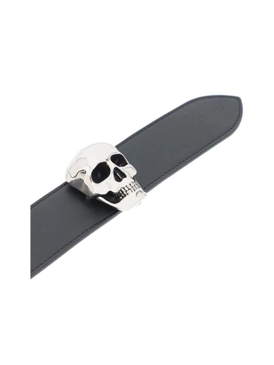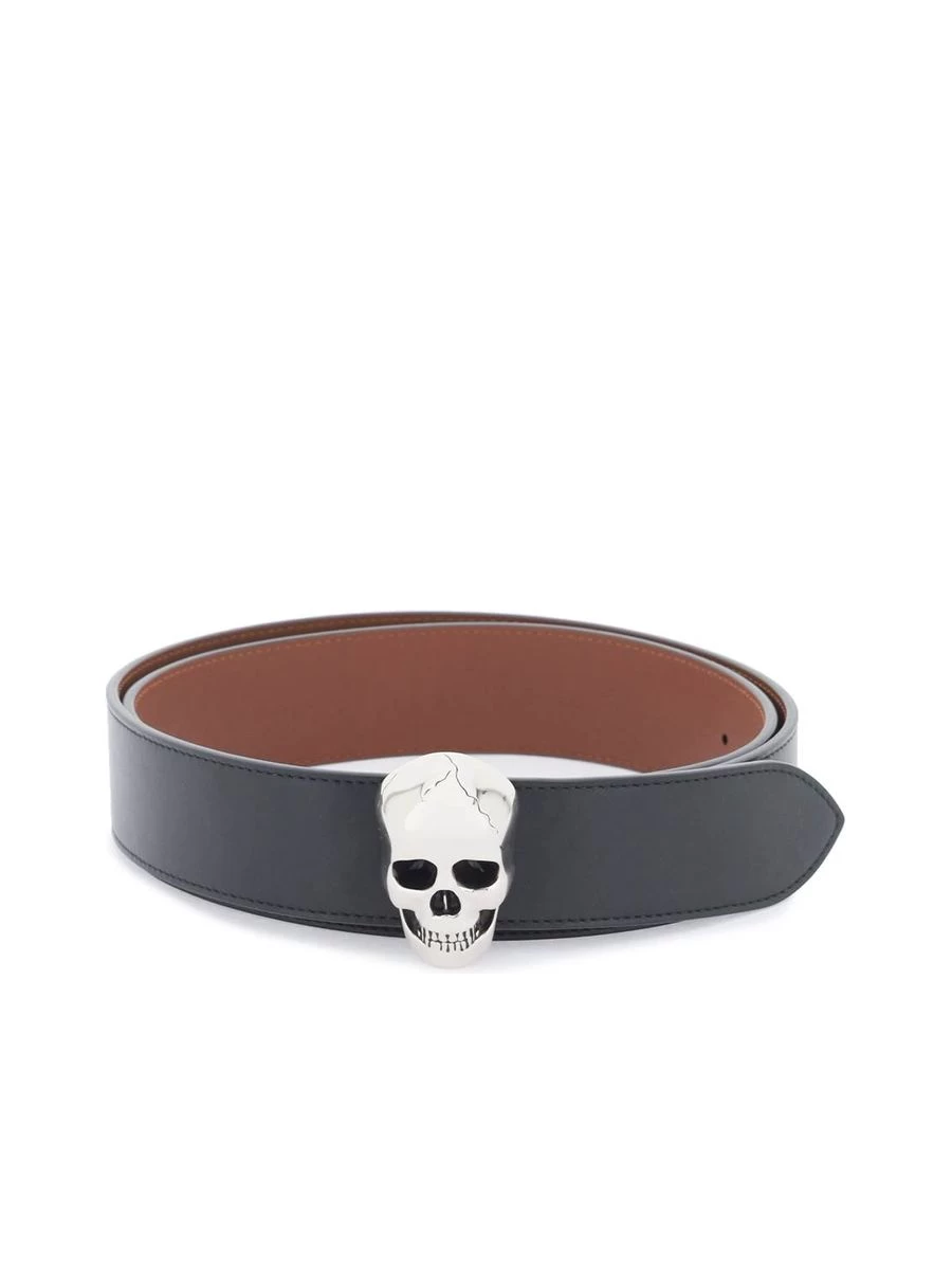 Exude edgy sophistication with a touch of rebellious spirit in this reversible leather belt, adorned with a striking 3D silver metal skull emblem that captivates and commands attention. Expertly crafted in Italy, this statement accessory epitomizes the iconic and avant-garde aesthetic synonymous with the legendary design house.