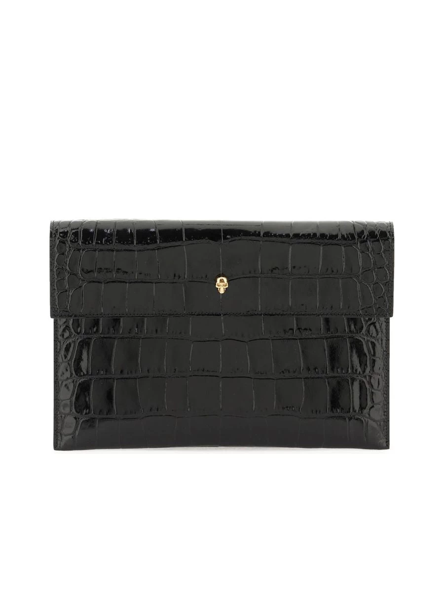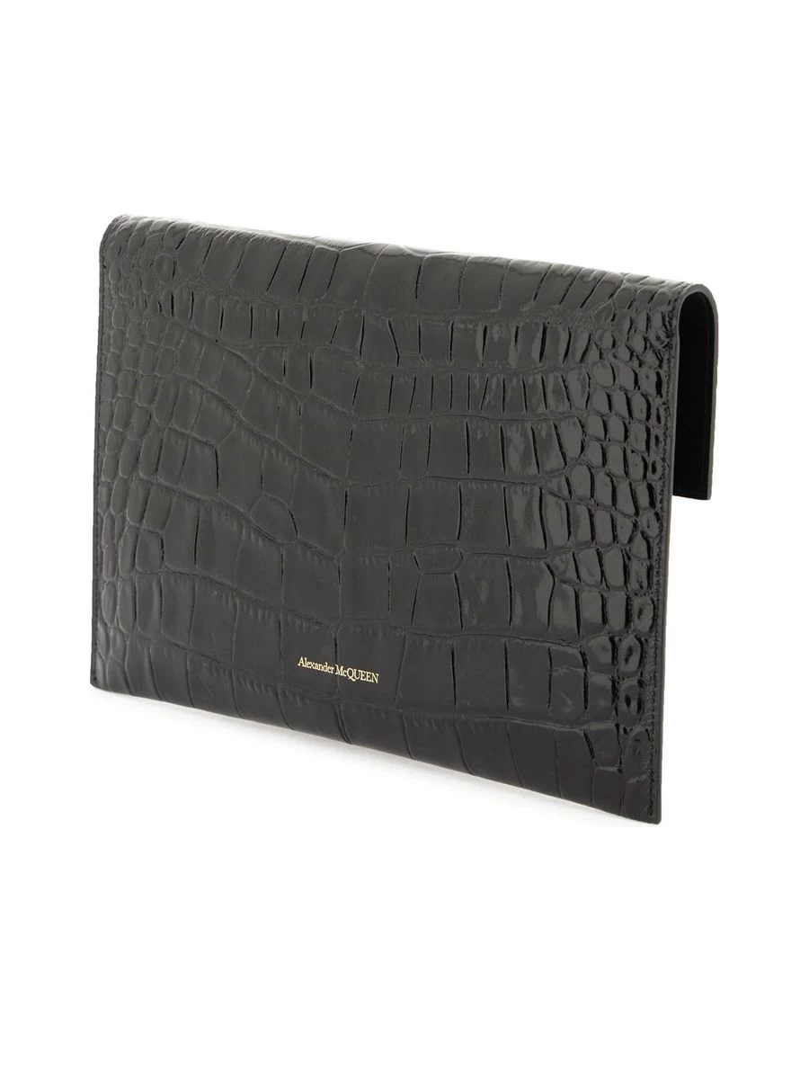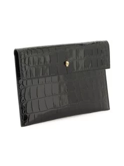Indulge in the opulent touch of Alexander McQueen with the exquisite envelope pouch. Crafted from sumptuous crocodile-embossed calf leather, this piece showcases the iconic metal Skull, delicately adorned with twinkling Swarovski crystals. Inside, a leather-lined interior awaits, featuring two convenient credit card slots and the gleam of gold-tone metalware.