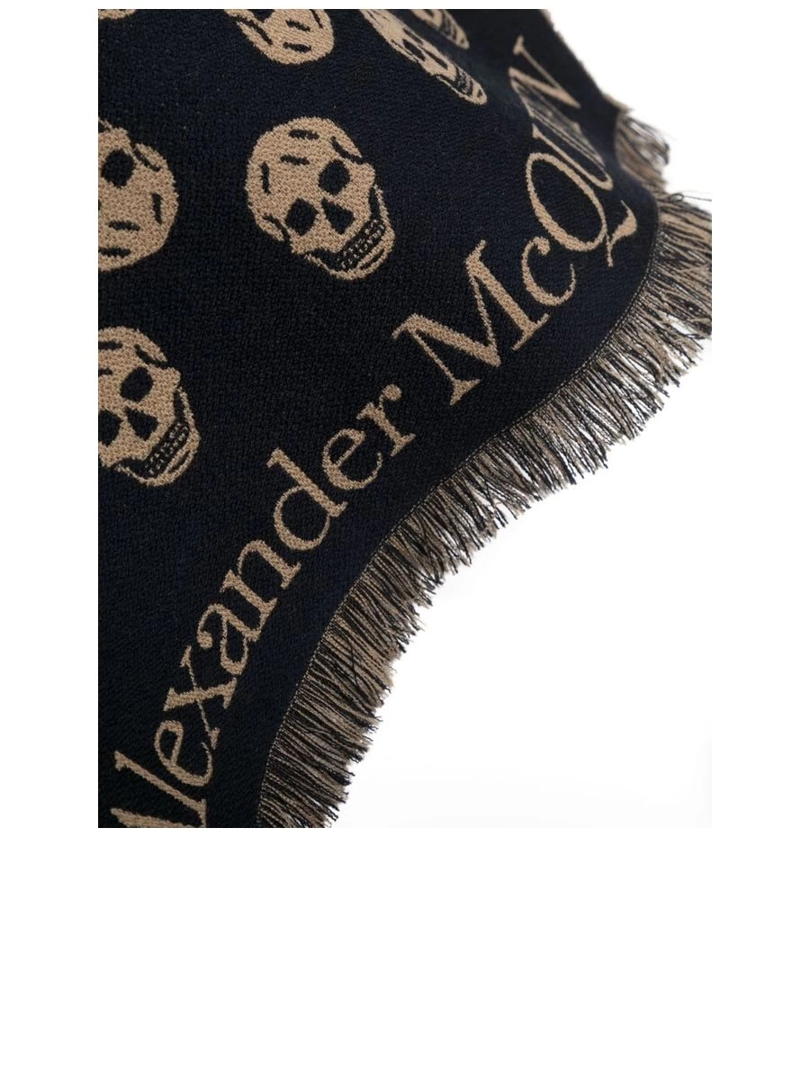 This scarf showcases Alexander McQueen’s signature gothic aesthetic with its intricately woven skull pattern and fringed edge. Crafted in Italy from sumptuous wool, it’s a luxurious and distinctive addition to any accessory collection. The jacquard weaving technique adds depth and texture, creating a piece that’s as visually striking as it is warm.