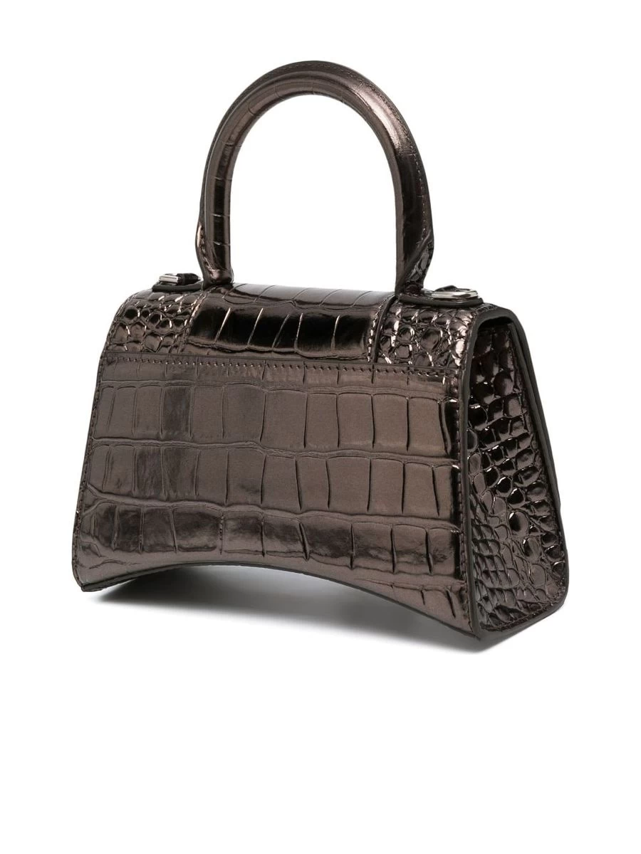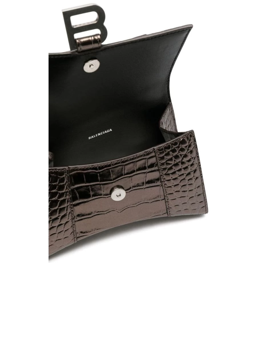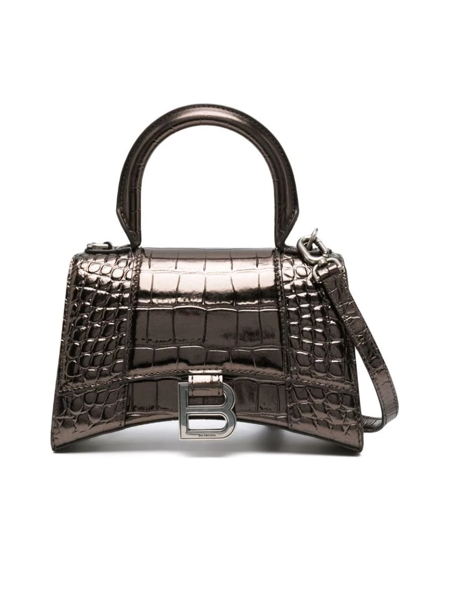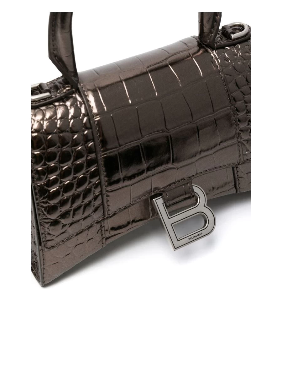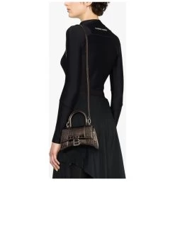 Discover the charm of our Hourglass XS Tote, a true manifestation of exceptional craftsmanship. This petite accessory boasts a croc-embossed texture, exuding elegance with its unique bronze-tone hardware. Featuring a sophisticated monogram plaque, it offers versatility with an adjustable detachable shoulder strap and a sleek circular top handle, all secured by a foldover top with a convenient magnetic fastening.