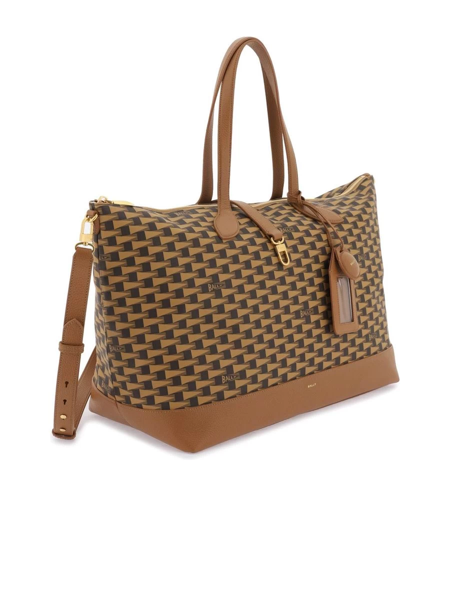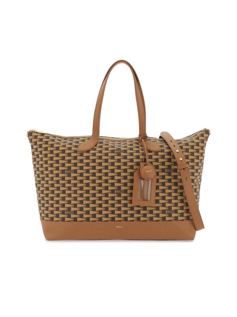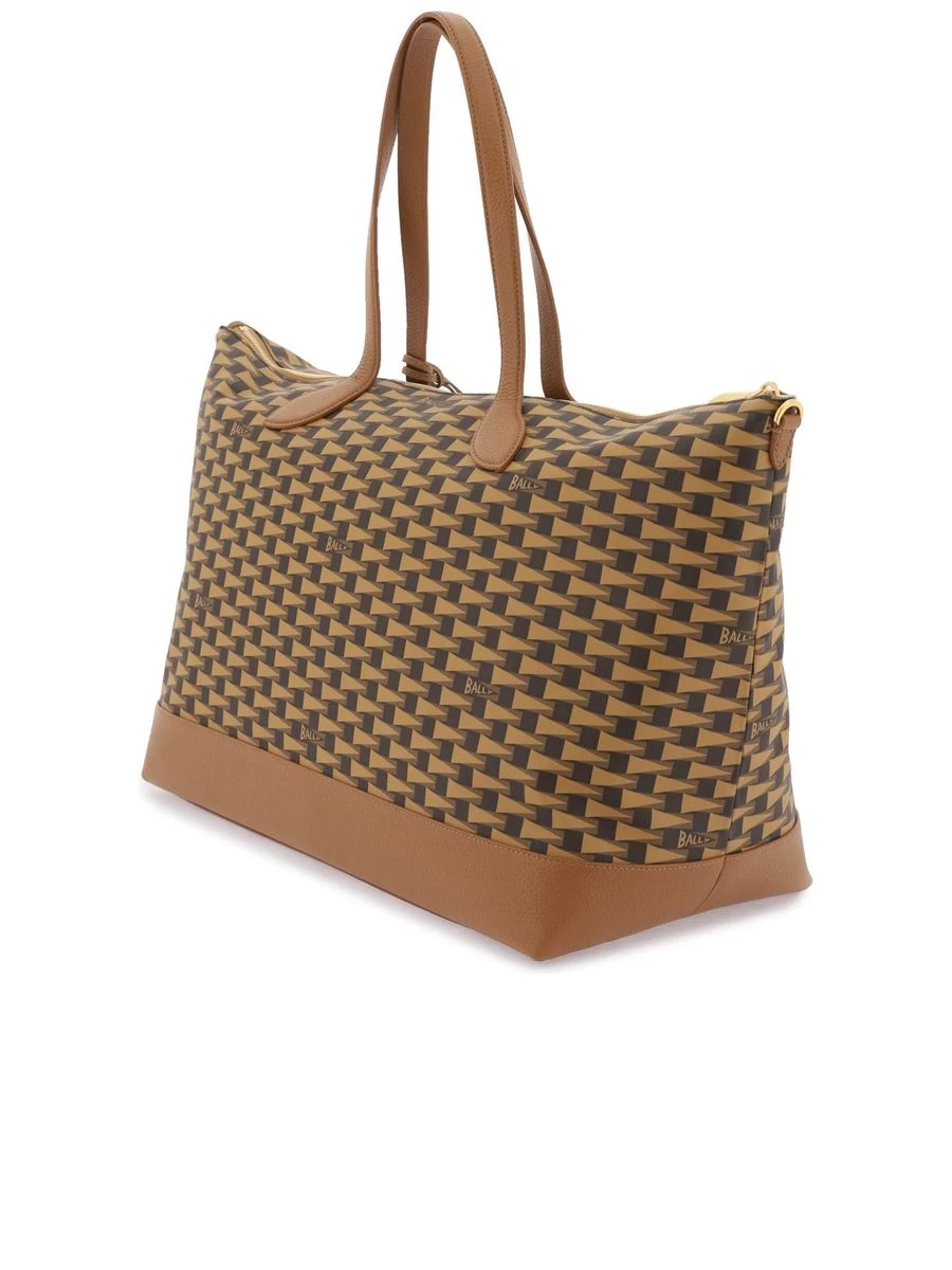 This Bally tote bag blends fashion with practicality, featuring the trademark Pennant pattern on coated canvas, enhanced by a robust leather base and handles for durability. The design includes a detachable and adjustable shoulder strap for versatile carrying options. Its secure zippered top opens to a lined interior, offering both open and zippered pockets for organization, accompanied by a removable leather tag and tasteful gold-finish hardware.