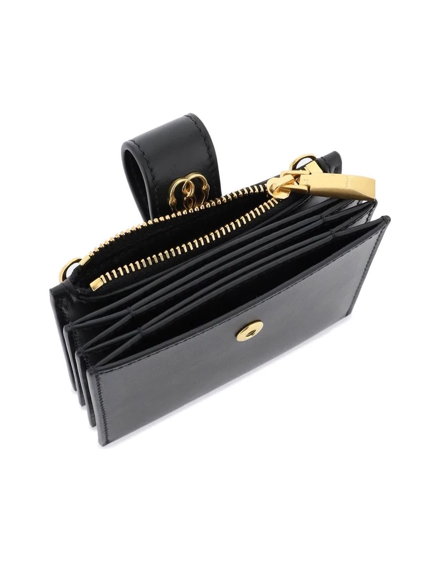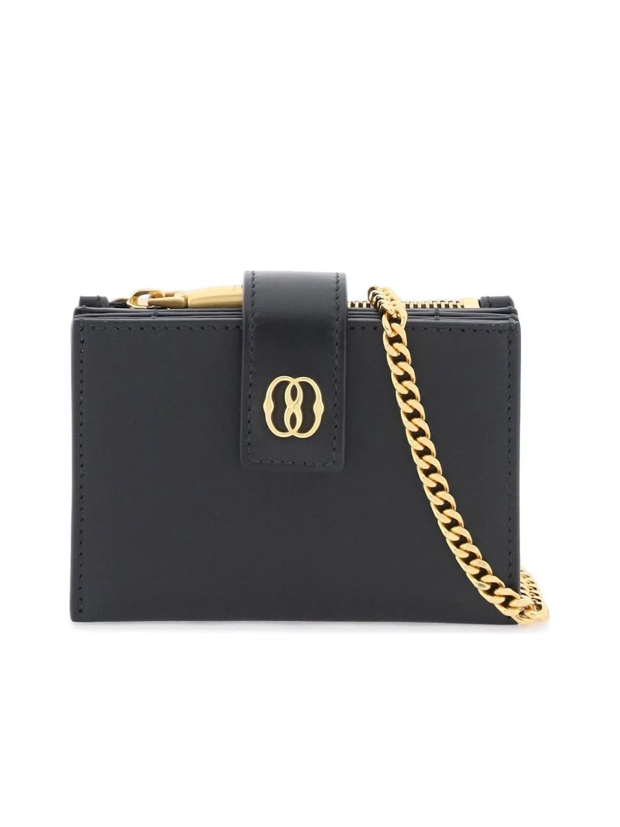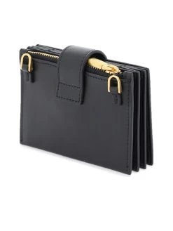 Crafted from smooth leather, this elegant cardholder presents an accordion design for easy access to your essentials. With a secure snap-summary closure, it’s outfitted with multiple pockets for cards and a zipped compartment for coins. The detachable chain shoulder strap offers versatile carrying options, complemented by gleaming gold-tone metal details.