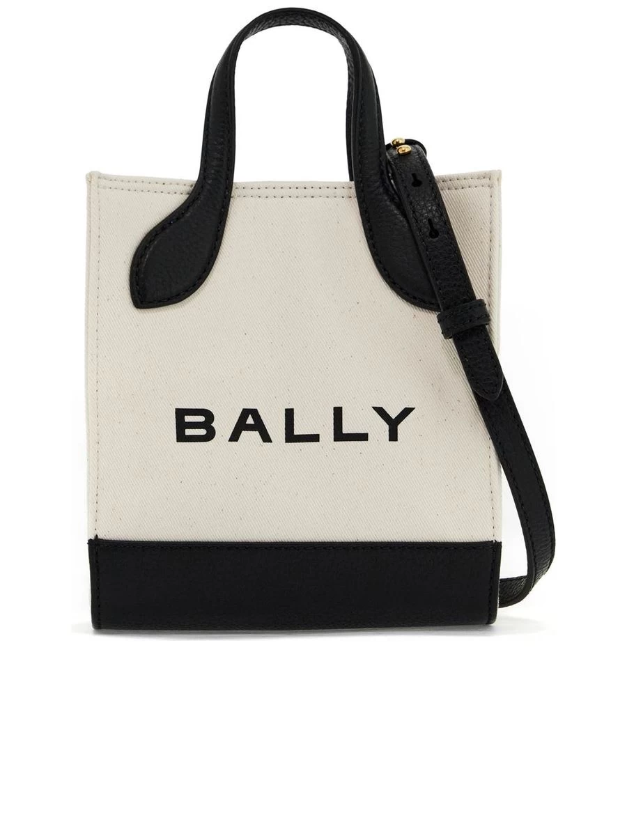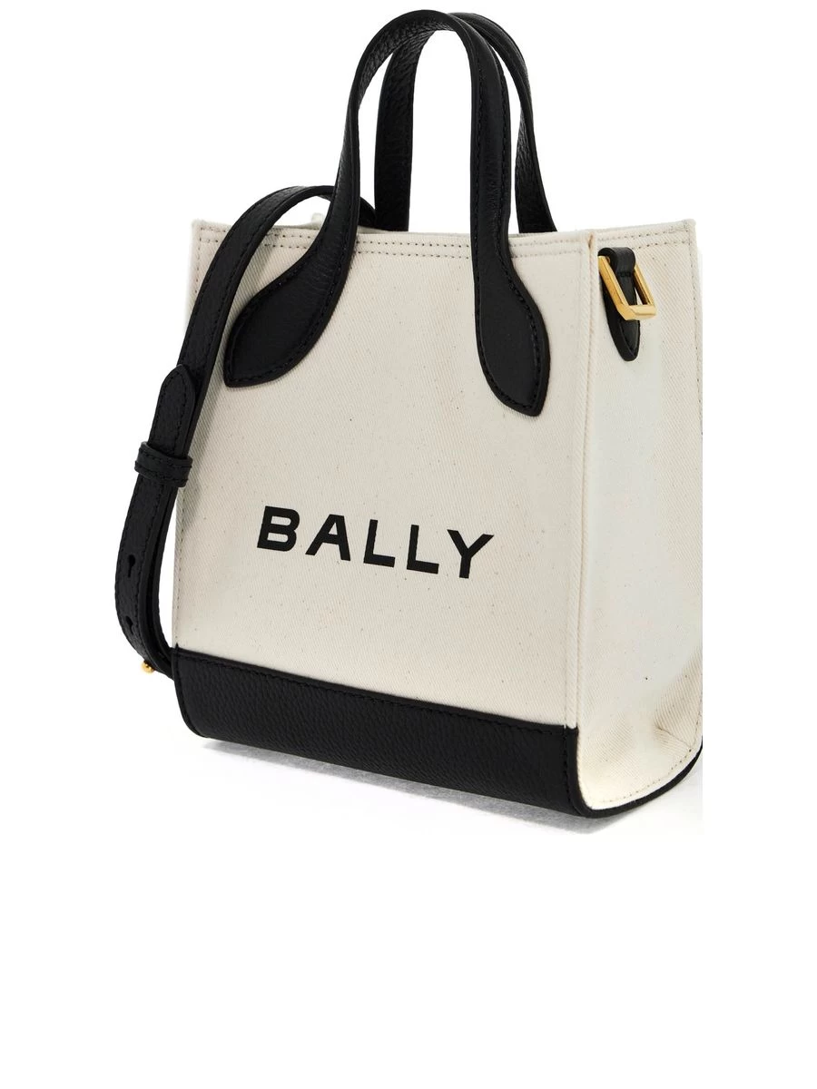 The Bar Keep On mini handbag from Bally emerges as a chic accessory with a vivacious blend of organic cotton drill and refined hammered leather detailing. Its sleek form is accentuated by a distinctive printed logo and is completed with functional elements such as a secure magnetic summary closure, internal pocket arrangement, and versatile carry options including both elegant double handles and a practical, adjustable, and detachable shoulder strap. Gold-finish metal accessories add a touch of understated opulence to this contemporary piece. An ideal companion for both day and night engagements, crafted to infuse luxury into the everyday.