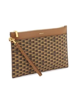 Elevate your everyday essentials with the Bally Pennant pouch, a highlighted piece from the latest collection. Its structured design features a robust coated canvas showcasing the iconic Pennant pattern, complemented by sumptuous grained leather trim. The pouch secures your belongings with a reliable zip closure, opening to reveal a practical fabric-lined interior equipped with multiple slots and compartments for seamless organization. Its versatile nature is further enhanced by a detachable leather wrist handle and an additional exterior pocket. Refined gold-finished metalware completes this sophisticated accessory.