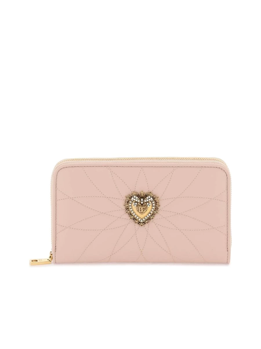 Savour the renowned craftsmanship and luxurious quality of the Devotion zip-around wallet. This stunning piece features a neatly quilted nappa leather exterior, highlighted by a handcrafted sacred heart emblem adorned with embedded pearls. It opens to reveal an organisational haven with gusseted compartments, card slots, and a secure zipped pocket, all finished in fine leather and sumptuous fabric lining.