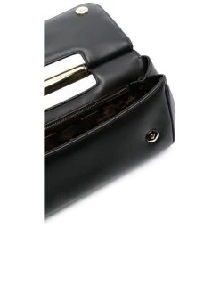 Indulge in the luxurious craftsmanship of a grained texture clutch, featuring a distinguished logo plaque and foldover top for a touch of elegance. This exquisite accessory boasts a unique cut-out handle design, a spacious main compartment, and internal pockets for organization, all lined with a sophisticated leopard print. The rich gold-tone hardware and concealed magnetic fastening add an extra flair of refinement to this timeless piece.