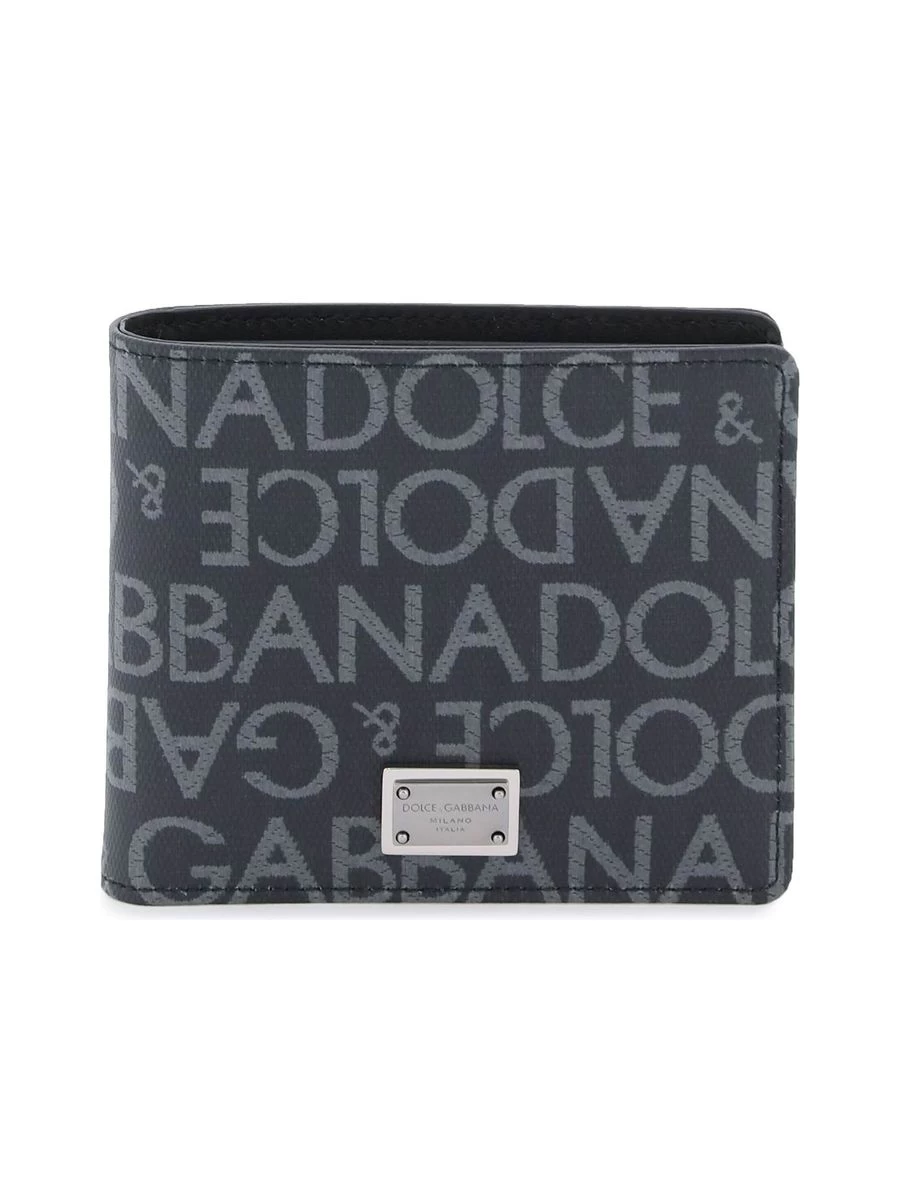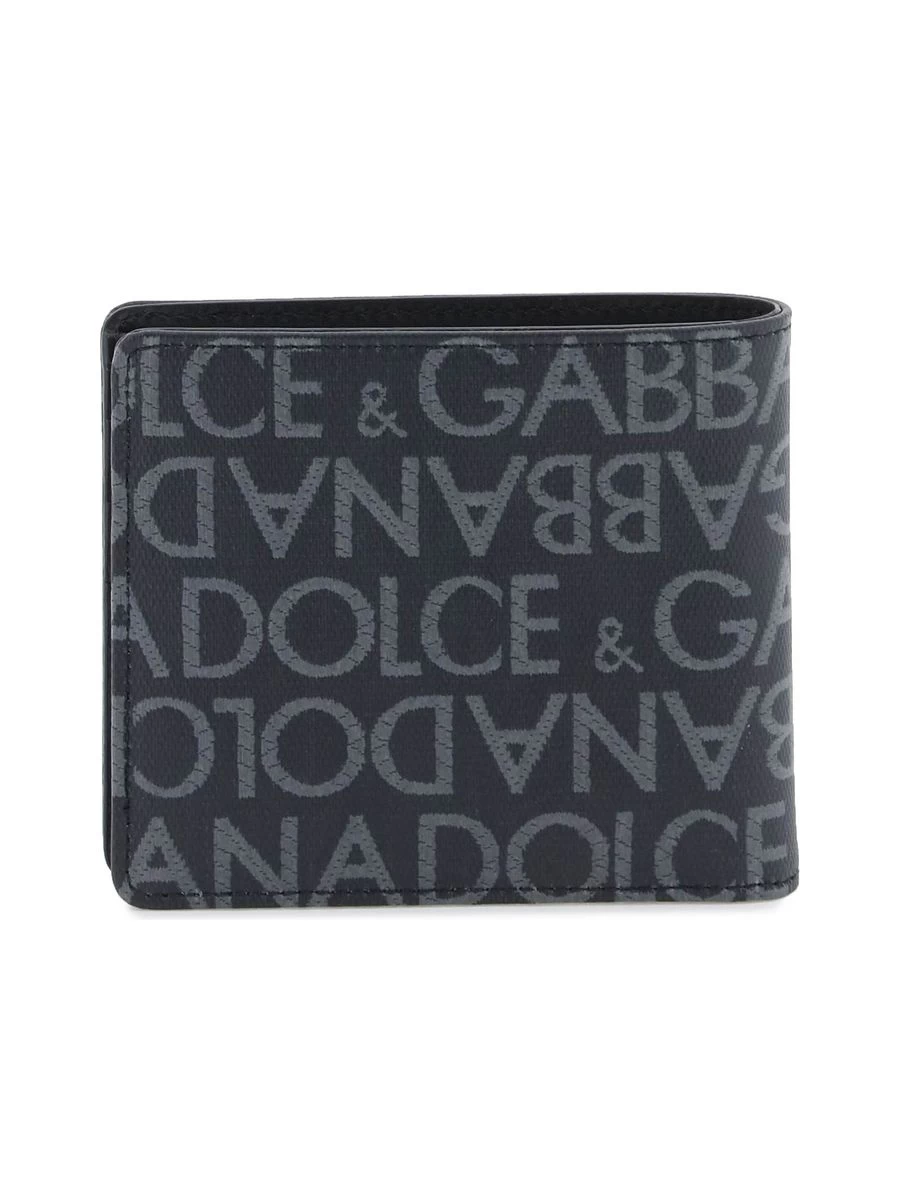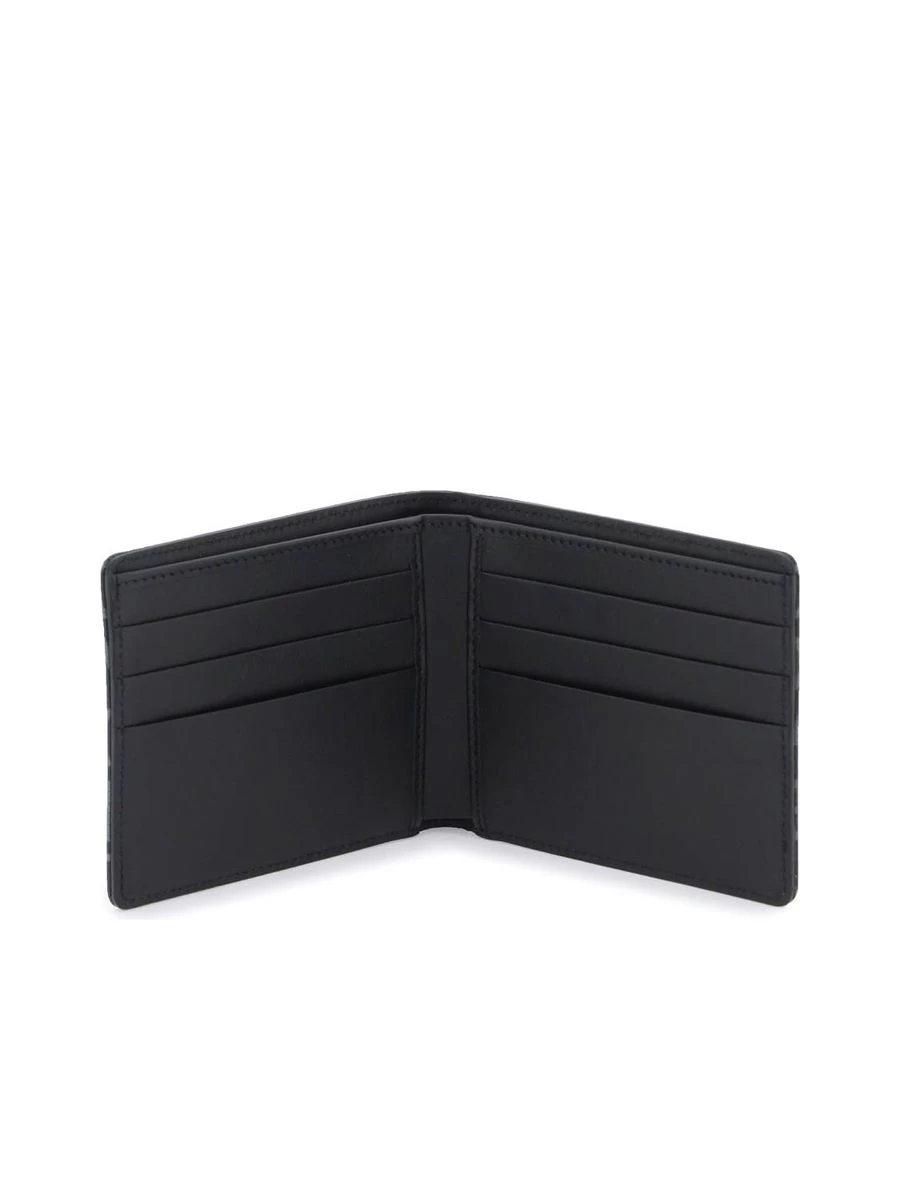 A chic bi-fold wallet crafted from a cotton-blend jacquard canvas, featuring a distinct all-over logo lettering. Its elegant leather interior is complete with a note compartment, multiple card slots, and additional pockets for practical organisation. Moreover, the wallet is adorned with a sophisticated ruthenium metal logo plaque.