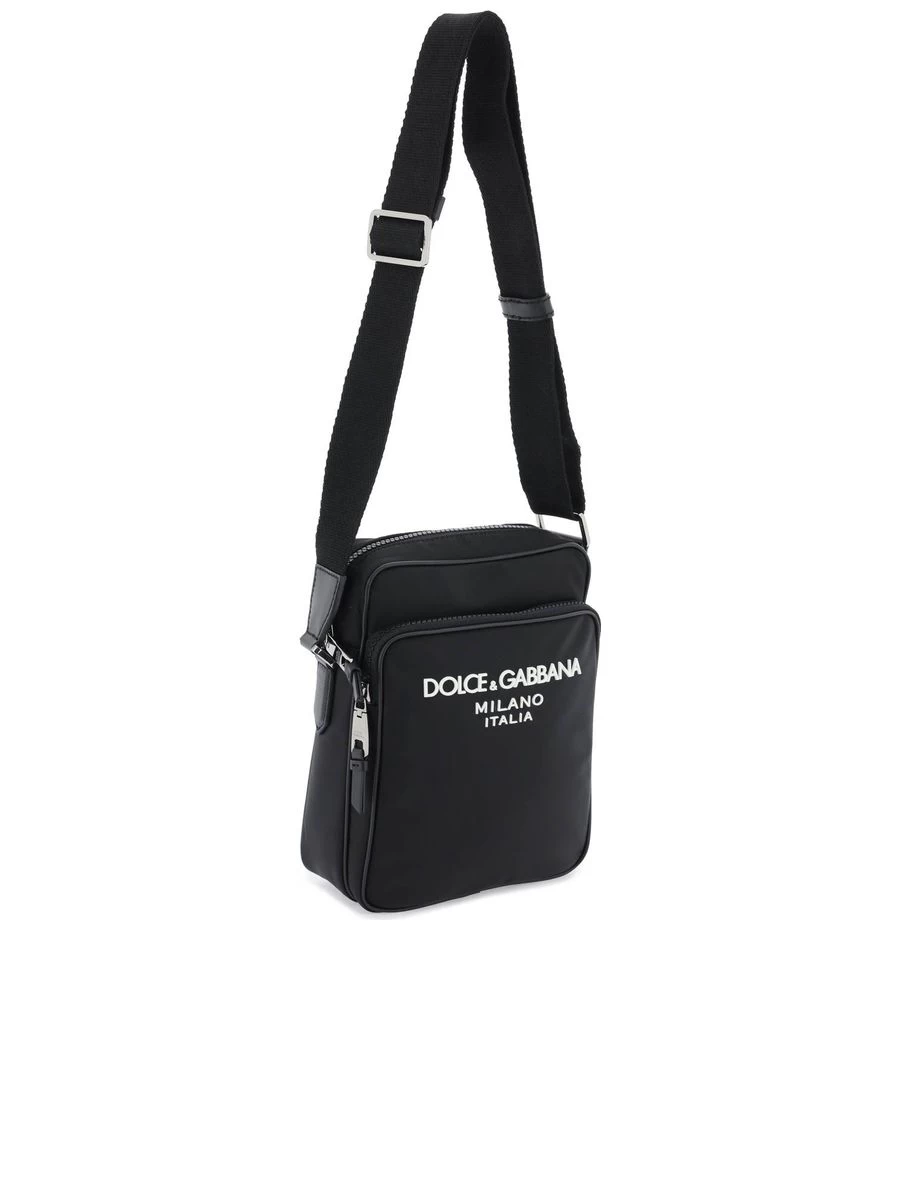 Channel the essence of casual sophistication with this nylon crosspeer bag, adorned with a distinctive rubberized lettering logo. Crafted with a blend of practicality and elegance, it offers dual zippered compartments and a sleek nylon lining, complemented by refined leather accents. The adjustable webbed shoulder strap and a medley of silver and ruthenium-finished metal hardware enhance its versatile charm.