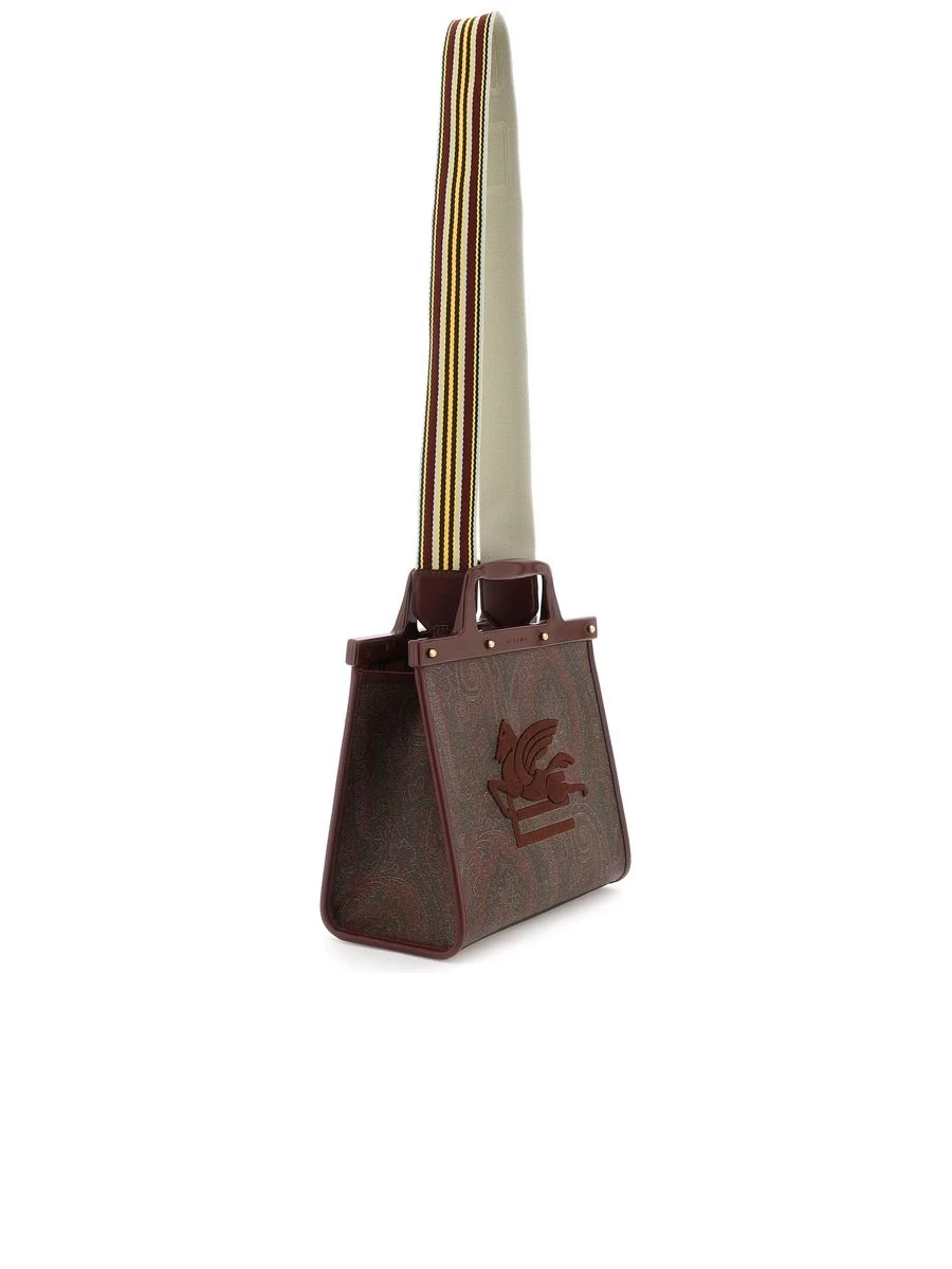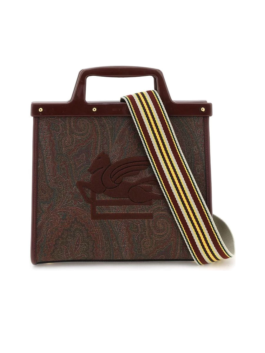 Champion a touch of elegance with the Love Trotter tote bag, a splendid homage to iconic Paisley patterns. Adorned with the beloved Pegasus emblem, this tote exudes charm with its luscious PVC handles, exquisite leather finishing and a robust base. Peek inside to discover a harmoniously striped fabric lining, replete with a handy zip pocket. Its detachable fabric shoulder strap and gleaming gold metal accents add a final flourish to its beautiful design.