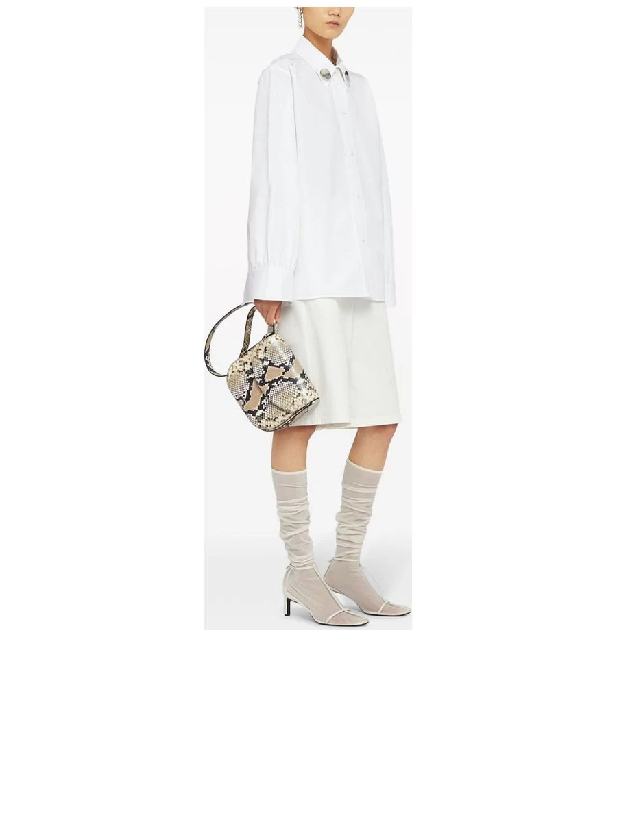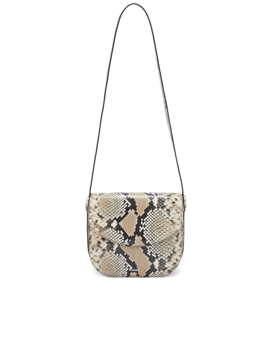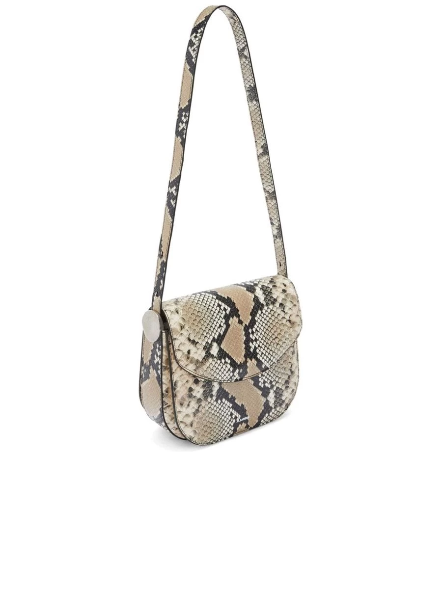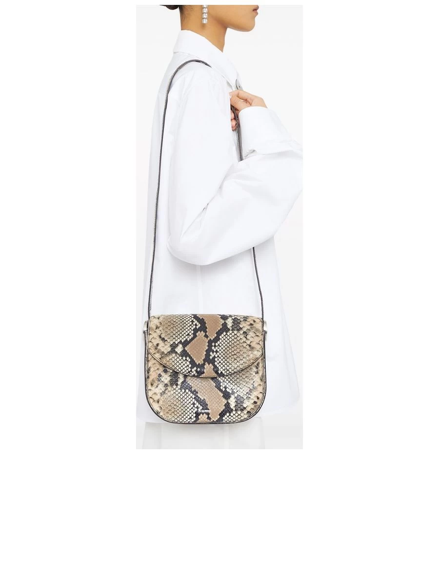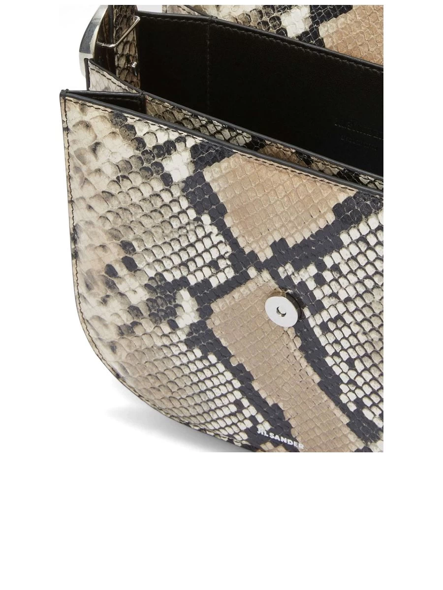 This tactile shoulder accessory boasts an exquisite snakeskin effect, crafted from 100% lambskin for a luxuriously soft touch. Its elegant foldover top opens to reveal a well-organized partitioned compartment, and the adjustable shoulder strap offers versatile carrying options. Designed and made in Italy, this bag merges functionality with high-end fashion.