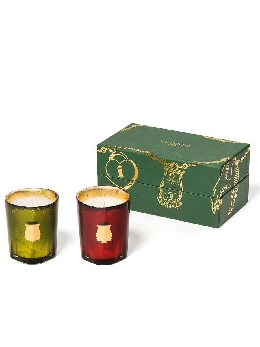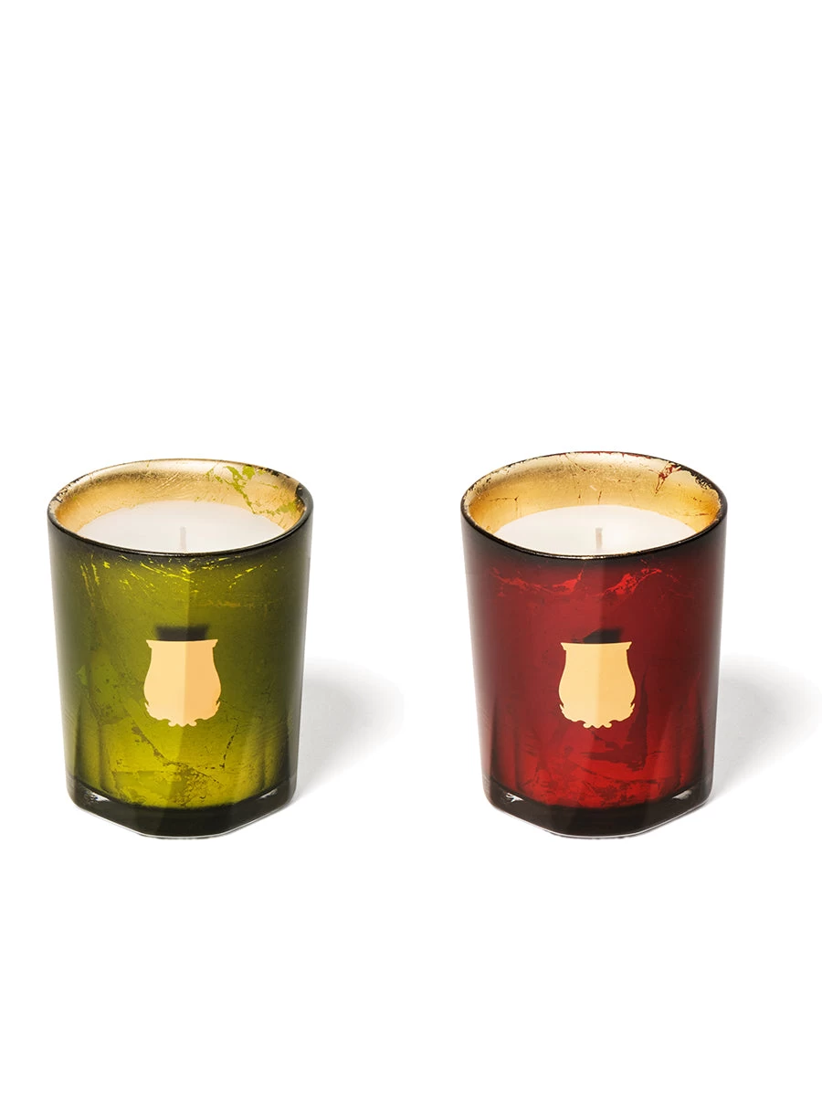 Presented in a forest green giftbox adorned with hot gold illustrated charms, Gloria and Gabriel celebrate Nativity. The two Petites candles (70g) come in red and green lacquered glasses, inlaid with gold leaf on the inside. The ideal Christmas gift set.