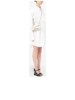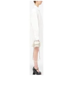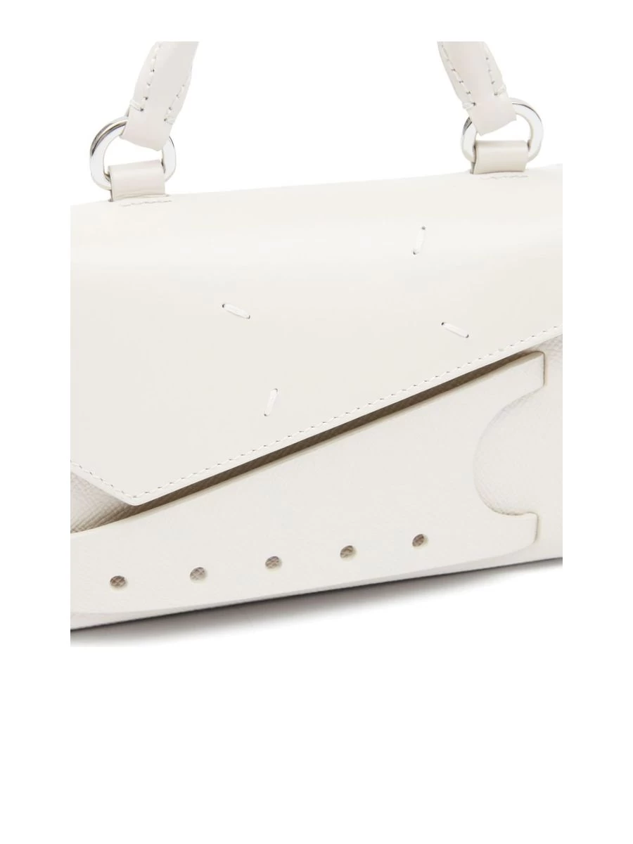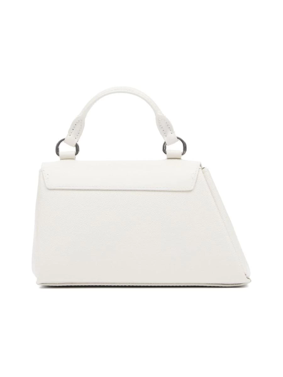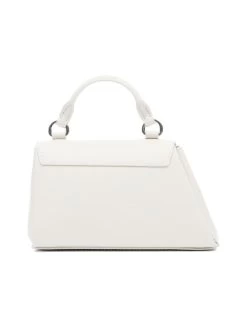 Discover the elegance and utility of this premium handbag, crafted with finesse from off-white calf leather. Detailed with signature silver-tone hardware and the iconic four-stitch logo, this accessory features a sturdy top handle complemented by a chic cable-link chain. The foldover top opens to a spacious main compartment, perfect for your daily essentials.