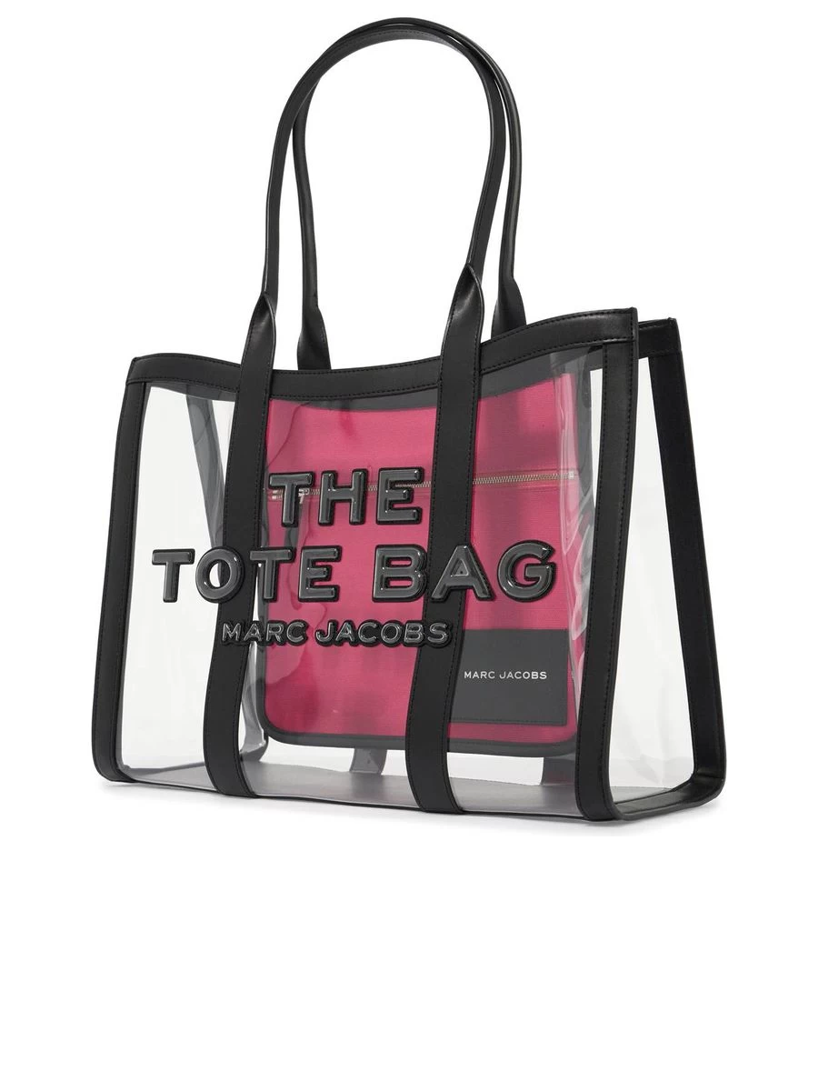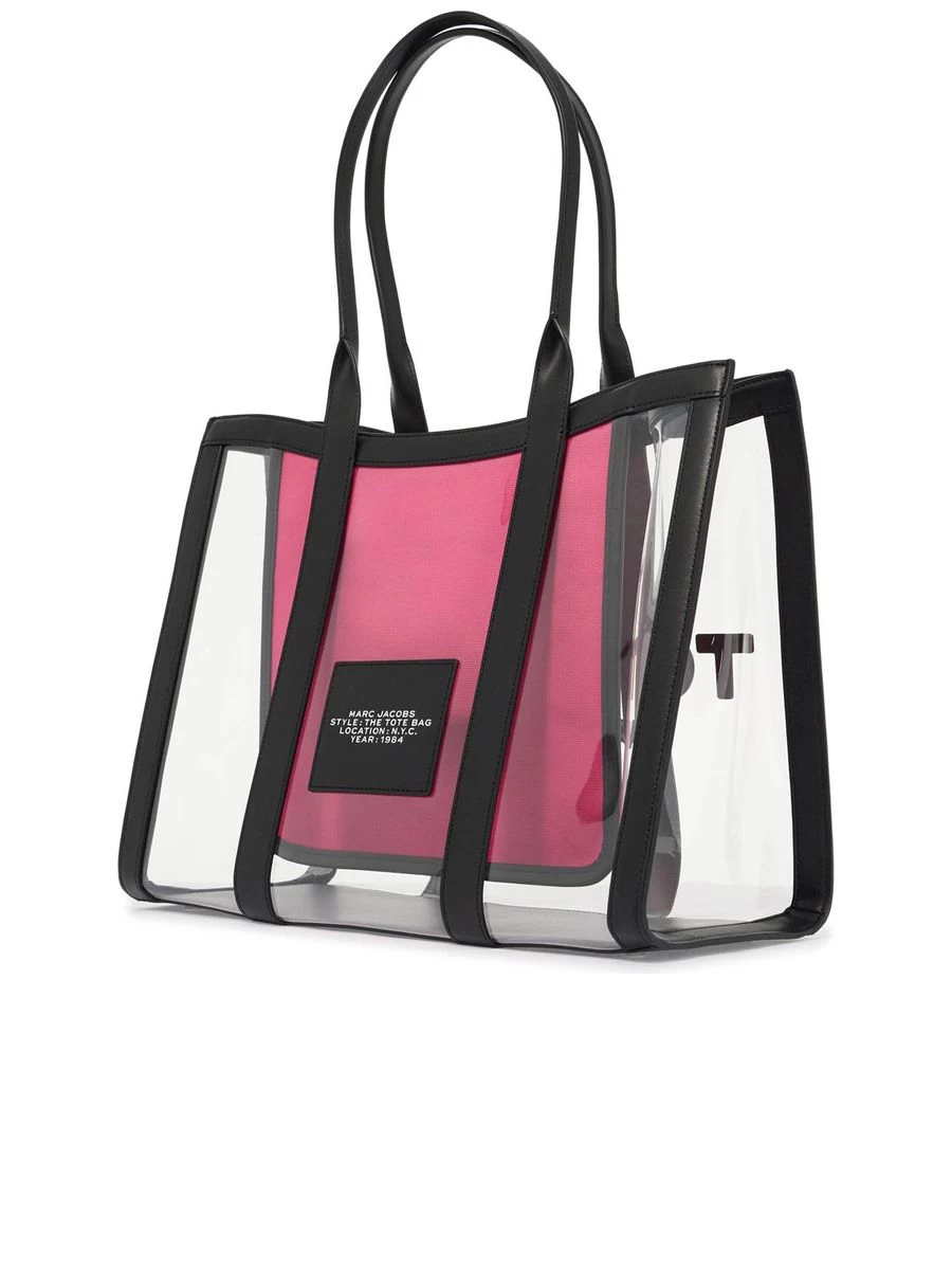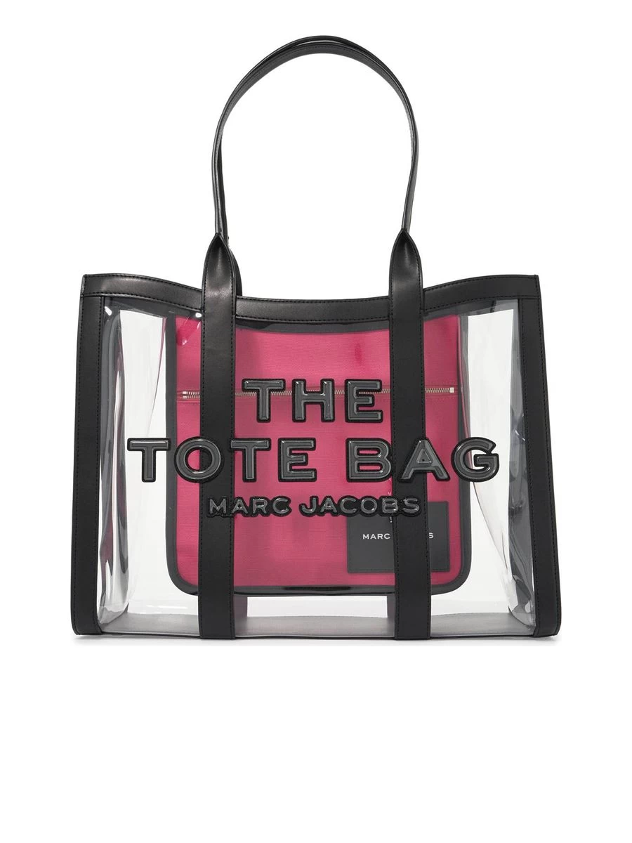 This large tote bag is a modern nod to an iconic design, elegantly crafted with transparent PVC and complemented by smooth leather finishes. Its open top design showcases an interior pocket adorned with a vivacious fuchsia zip and a discreet leather card holder, perfect for keeping essentials organized. With the practicality of metal feet at the base and a traditional leather label at the back, it marries functionality with distinctive style.