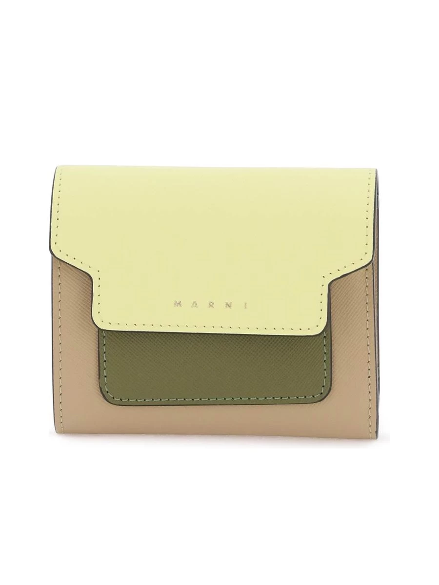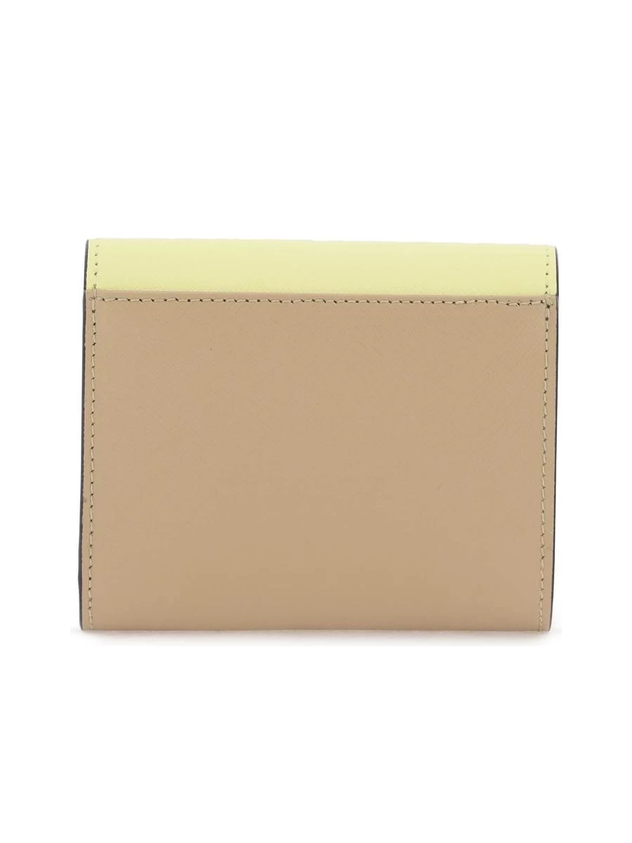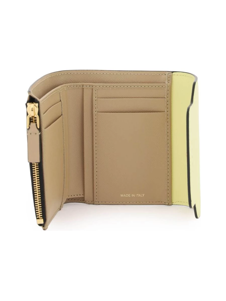Crafted from multicoloured Saffiano leather, this bi-fold wallet exudes timeless elegance with its flap and press-stud closure, adorned with a gold-tone lettering logo. The interior boasts a leather and fabric-lined compartment, multiple pockets for tickets and cards, and a secure zipped coin pocket, all finished with exquisite gold-finished metalware.