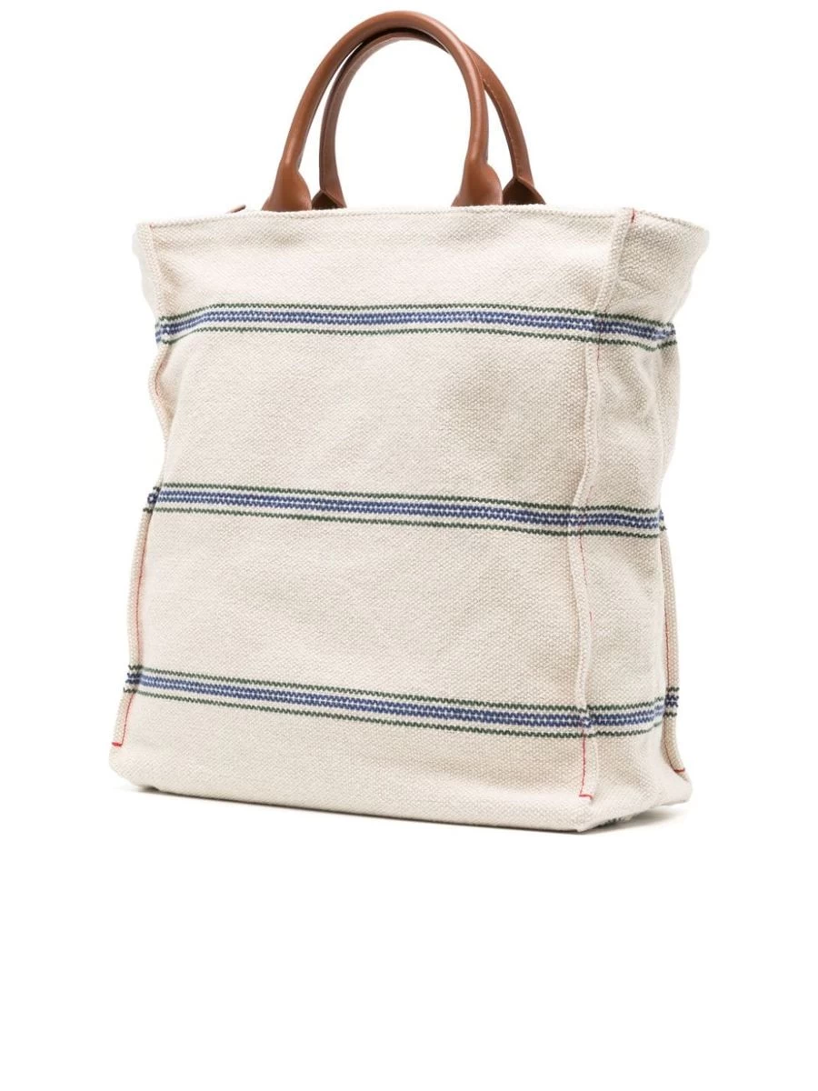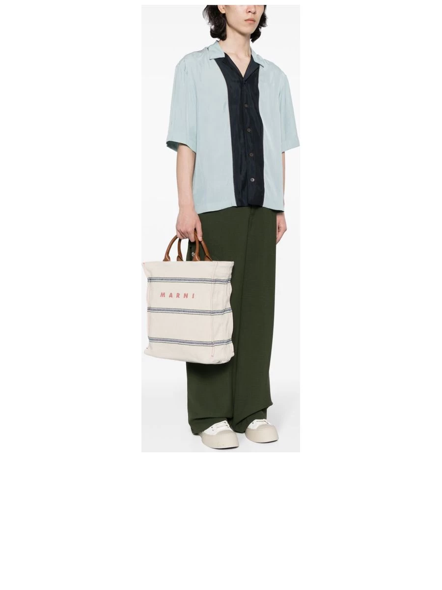 This Marni shopper bag features a sophisticated horizontal stripe design complemented by a chic logo print on the front. Crafted from a blend of cotton and polyester, the bag offers spacious storage in its main compartment, equipped with an internal zip-fastening pocket to safely stow essentials. It also boasts versatility with both sturdy leather top handles and a removable shoulder strap for alternate carrying options.