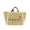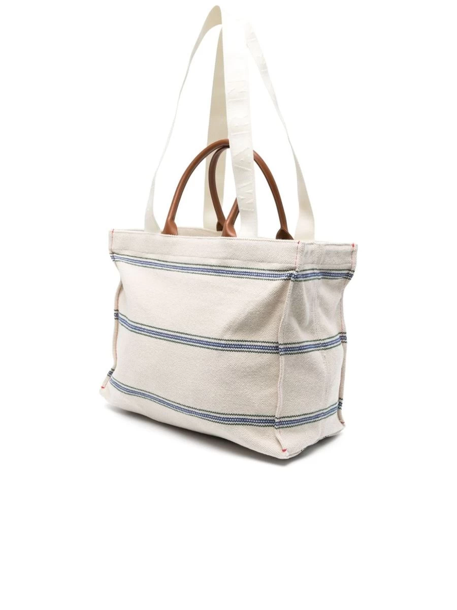 A Marni shopper bag with a minimalist yet contemporary flair, crafted from a durable blend of cotton canvas and polyester. It makes a practical everyday accessory with its unlined, capacious main compartment, complemented by an internal patch pocket for organizing smaller items. The leather top handles add a touch of elegance to the functional design, adorned with horizontal stripe embroidery and an embroidered logo front and centre, showcasing the brand’s distinct aesthetic. A protective dust bag is included ensuring the bag’s longevity.