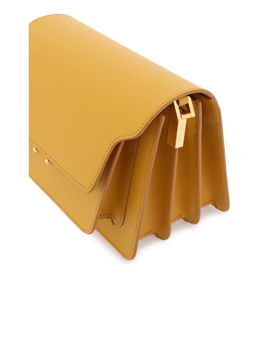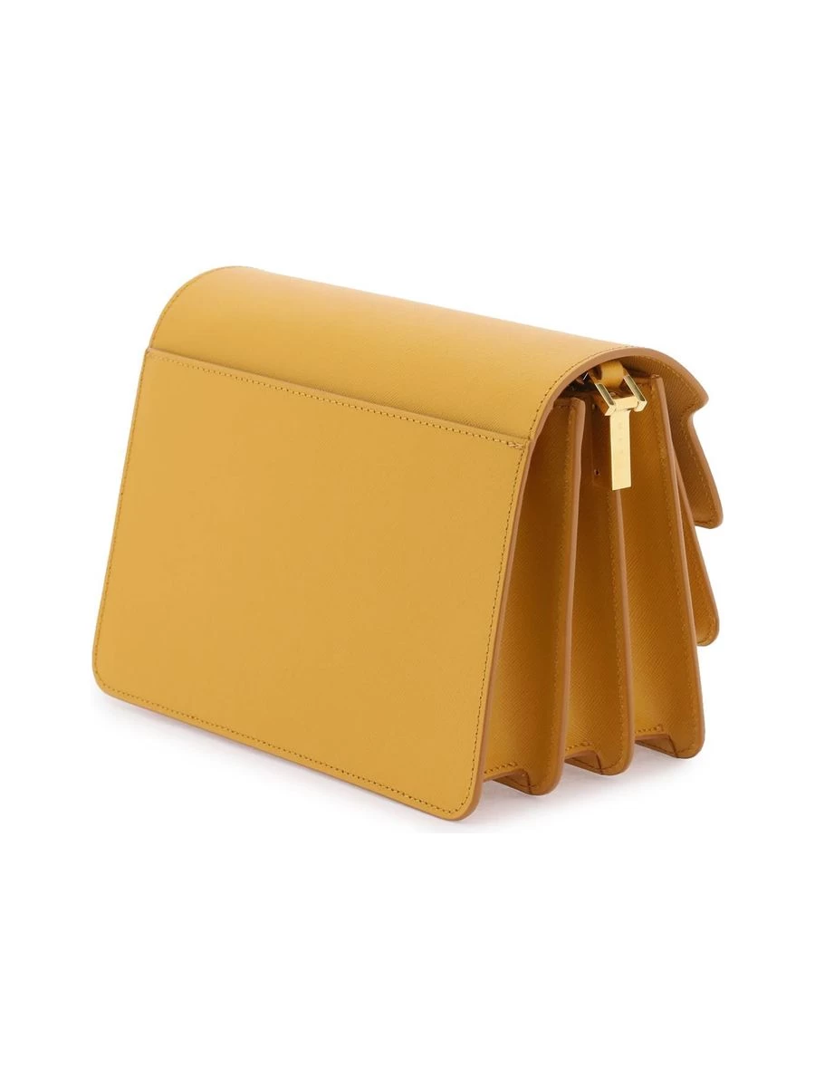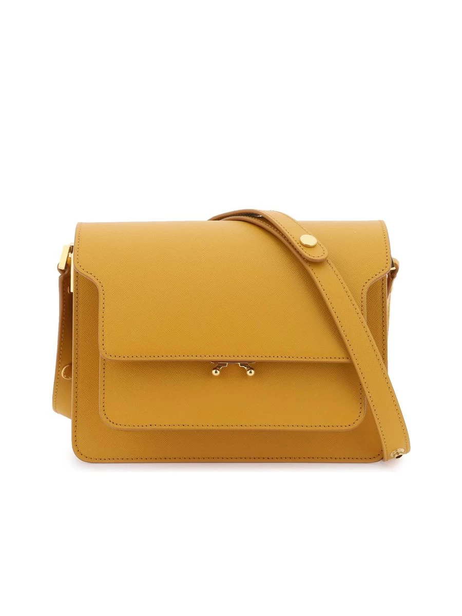 Indulge in the blend of timeless elegance and functionality with the Marni ‘Trunk’ bag. Crafted from exquisite saffiano leather, this medium-sized accessory charms with its structured silhouette and practical compartments. The bag features an adjustable shoulder strap for tailor-made comfort, a flap with a secure snap closure, and ample storage, including a back slit pocket, four compartments, and two zipped pockets for your valuables. Complementing the design, the gold-tone metal hardware adds a hint of sophistication.