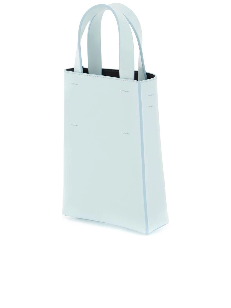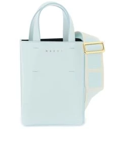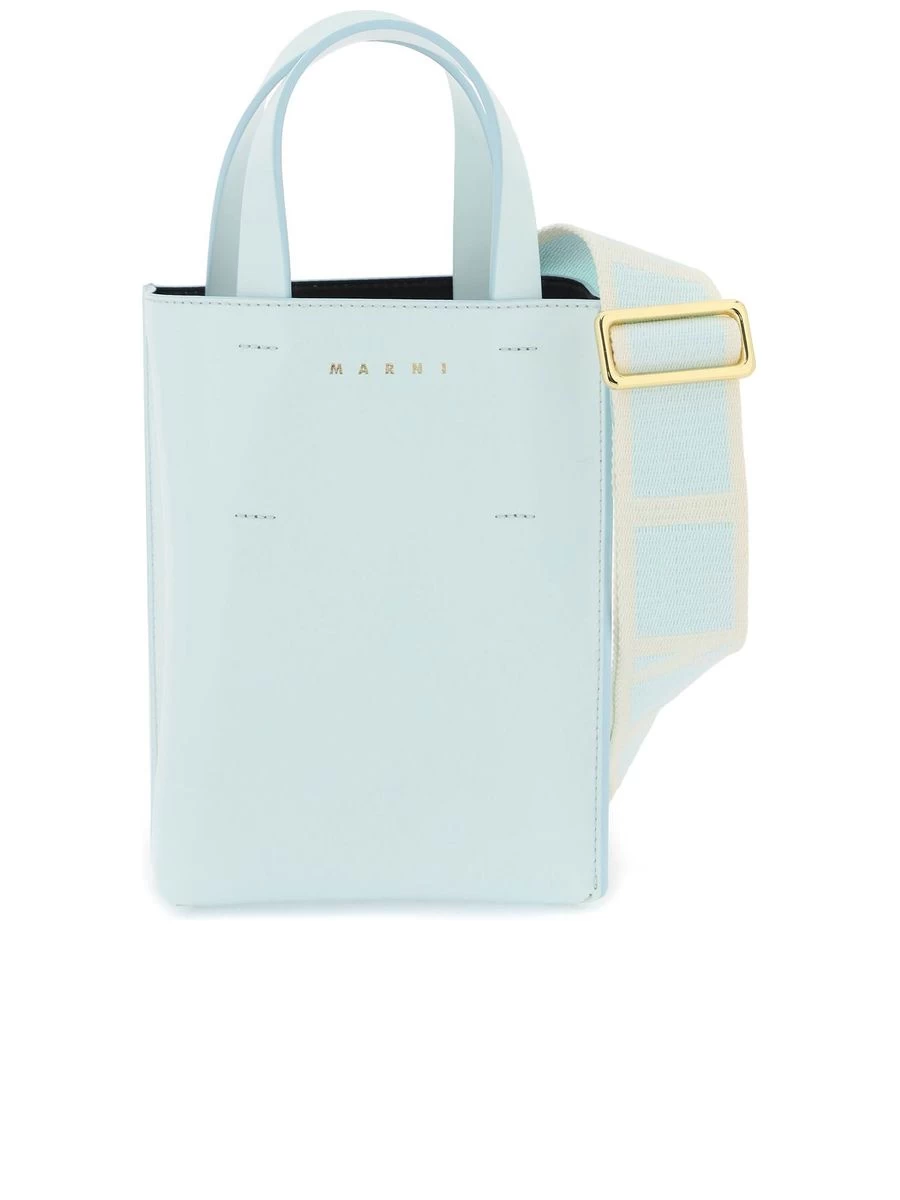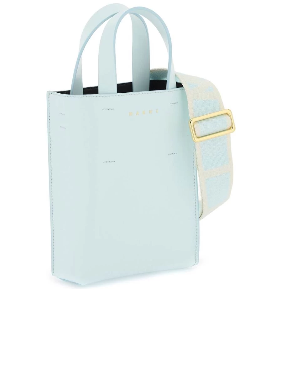 Embrace the sophisticated charm of the Nano Museo tote bag from a distinguished Italian label. This sleek leather piece boasts a structured shape and a minimalist aesthetic, elevated with a striking gold-tone logo on the front. Practical features include a smooth, contrasting interior with a convenient patch pocket, as well as both double handles and an adjustable, detachable shoulder strap for versatile carrying options.