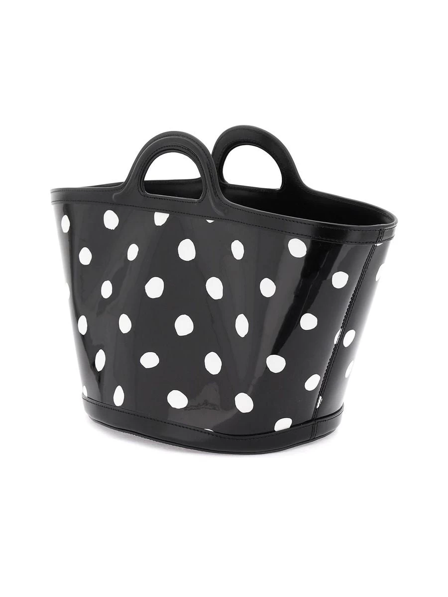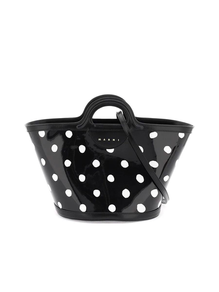 Infuse a dash of playfulness into your ensemble with the Tropicalia bucket bag, a small yet striking accessory by Marni. This patent leather piece boasts a delightful polka-dot pattern, enhanced by a lustrous gold-tone logo. A practical inner snap-hook closure keeps your belongings secure, while the versatility of the bag is elevated with both sturdy leather top handles and an adjustable, detachable shoulder strap. Lined with cotton, its interior also features a zipped flat pocket to keep essentials organized.