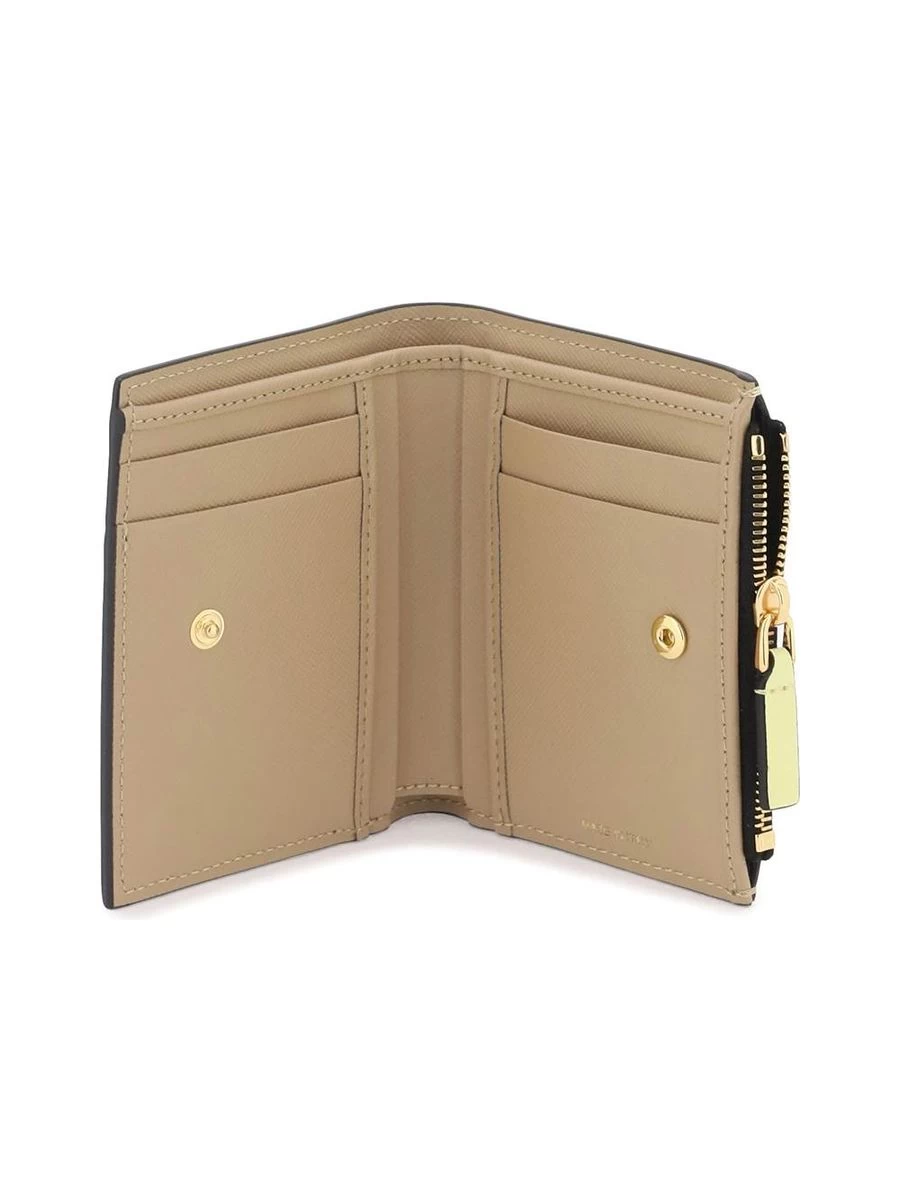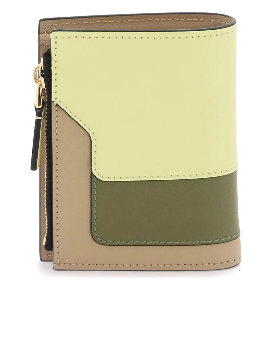 Crafted with exquisite Saffiano leather, this bi-fold wallet boasts a harmonious assembly of multicolored inserts alongside a gold-stamped logo. Its design offers a functional yet elegant snap-summary closure leading to a neatly organized interior complete with a bill pocket, card slots, additional pouches, and a secure zippered coin compartment. Gold-finished hardware adds a subtle hint of opulence to the accessory. Perfect for those seeking a blend of practicality and style in their everyday carry.