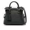 Experience the uniqueness of a Japanese-inspired shape with this grained leather handbag from MM6 Maison Margiela. It features a distinct double triangle construction that concludes with an elegant leather-wrapped handle, proudly stamped with the brand logo. Its highly functional design allows you to change the shape of the bag with convenient press studs at the lower edges. The interior is lined with cotton and includes a practical flat pocket with a press-stud closure, while the exterior boasts MM6’s iconic straight white stitch detailing.