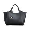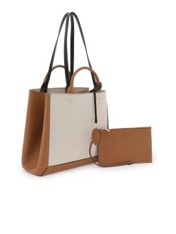 Embrace functionality without sacrificing style with this exquisite canvas and leather tote. Crafted with a fusion of cotton and linen canvas paired with sumptuously grained leather, it features a side snap summary closure and comes with a lined interior along with a removable pouch. Dual carrying options are offered through its four handles, designed for both hand and shoulder wear. The piece is tastefully completed with a removable leather logo keychain and gleaming silver-finished metalware.