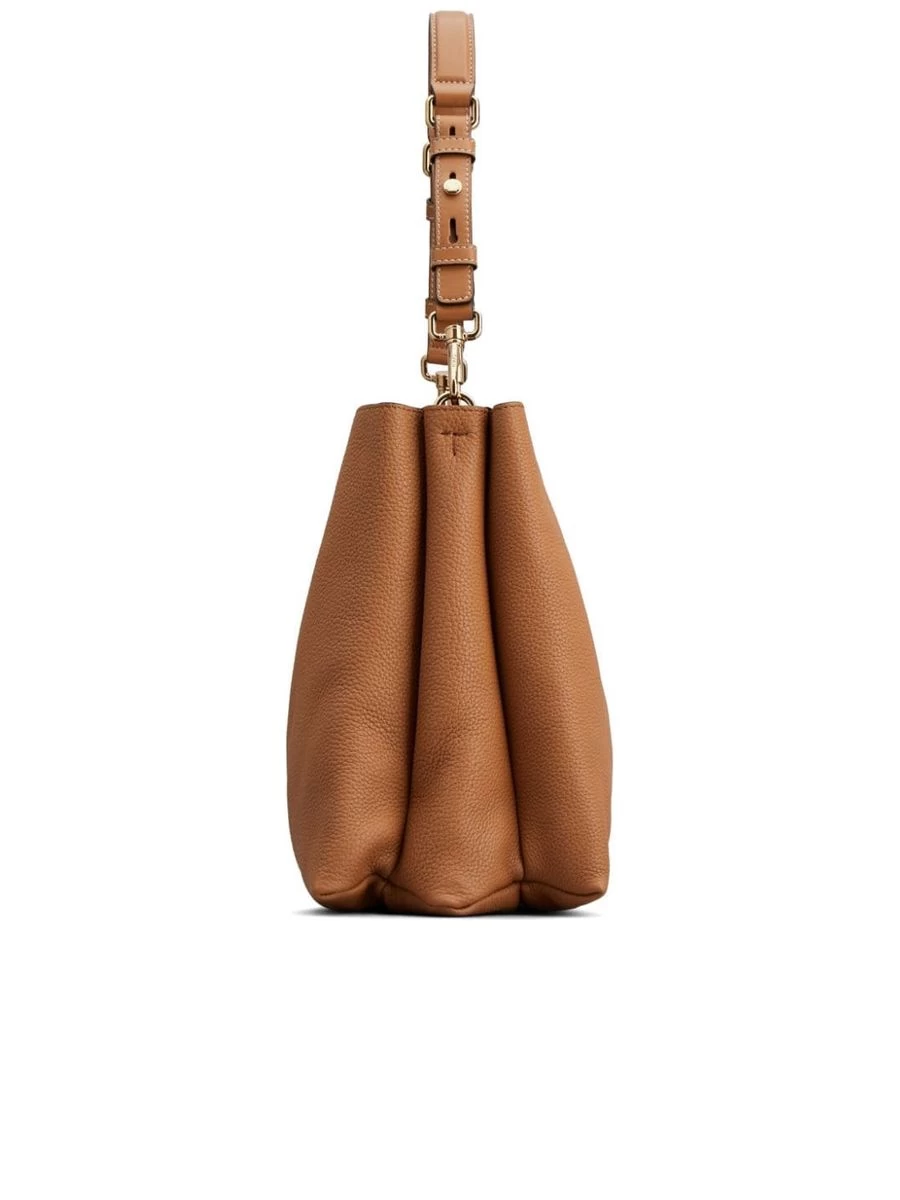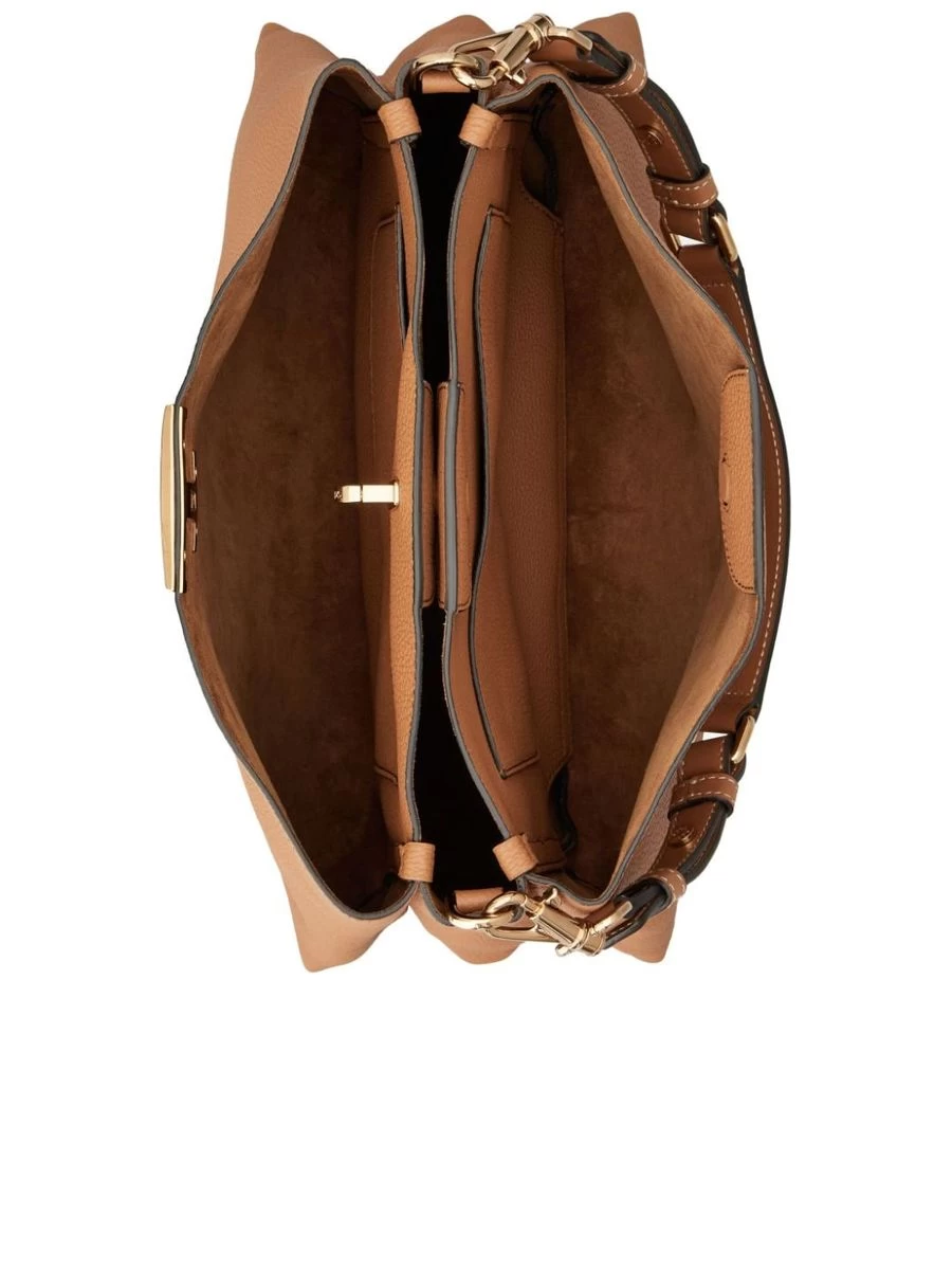 Indulge in the epitome of craftsmanship with this exquisite shoulder bag, featuring a luxurious grained texture, accented with a polished gold-tone logo plaque and hardware for a touch of elegance. Enjoy the versatility of an adjustable top handle, alongside a single detachable handle and an adjustable, detachable shoulder strap for various styling options. Security is gracefully integrated with a twist-lock and concealed magnetic fastening, leading to a compartmentalised interior lined with supple suede, complete with multiple slip pockets to organise essentials.