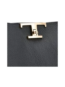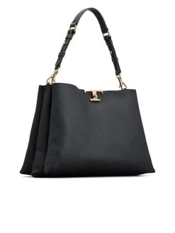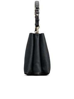 Elegantly crafted from black calf leather, this shoulder bag exemplifies fine Italian craftsmanship. Boasting a pebbled texture and a striking gold-tone logo plaque, the bag’s trapeze body shapes a distinct silhouette. A slight touch of opulence is lent by the gold-tone buckle adorning the twist-lock fastening. Inside, a partitioned compartment lined with smooth suede, along with multiple internal slip pockets, allows for optimum organisation. This accessory promises to bring both function and fashion to any ensemble.