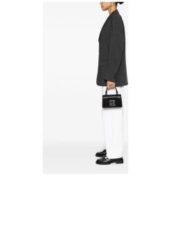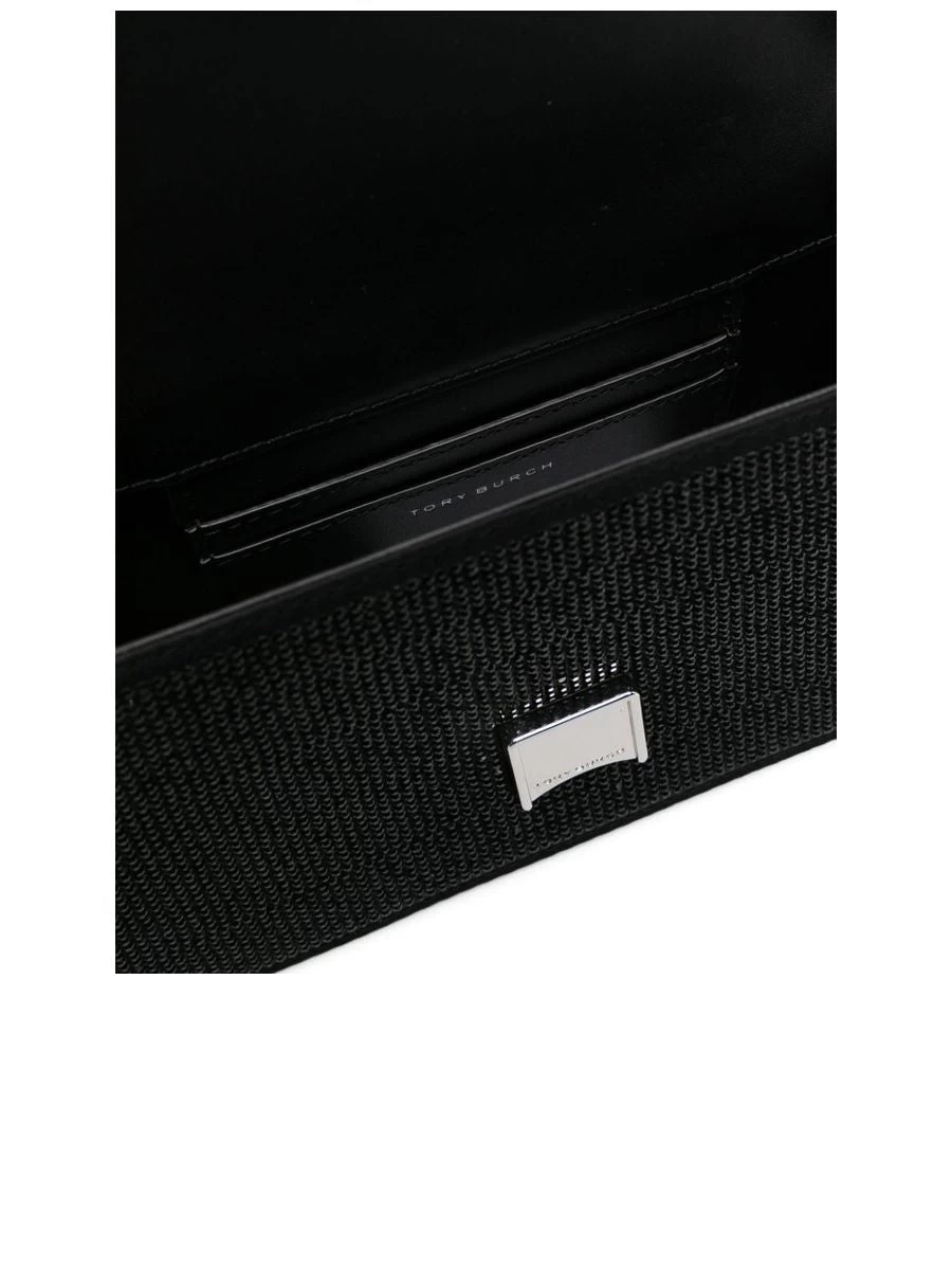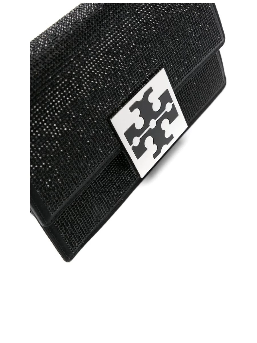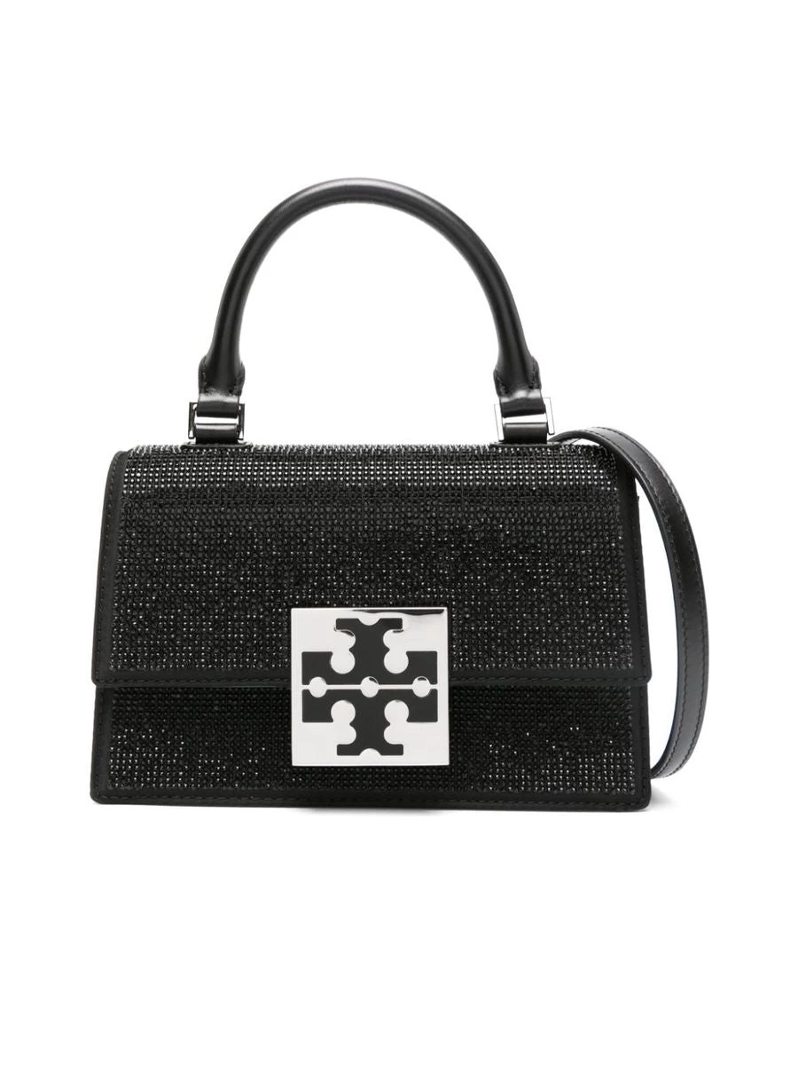 This Tory Burch handbag is a sophisticated accessory with a stylish flair, featuring a rhinestone embellishment and the signature Double T motif. Complete with an adjustable and detachable shoulder strap, it also provides a rear patch pocket and internal card slots for organization, while the silver-tone hardware adds a touch of elegance. The bag includes a protective dust bag.