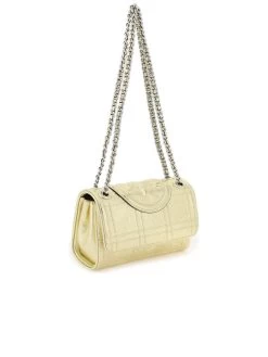 Elegance and practicality fuse in the Small Fleming bag by Tory Burch. This chic accessory is crafted from shimmering laminated nappa with a sophisticated quilted design, accentuated by the iconic Double T logo. Functional as it is fashionable, it boasts a versatile chain strap and a well-organised interior for seamless day-to-night transitions.