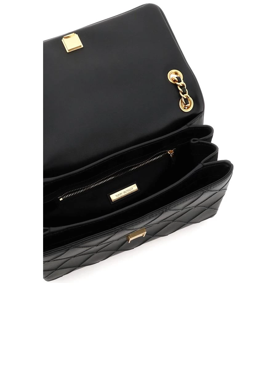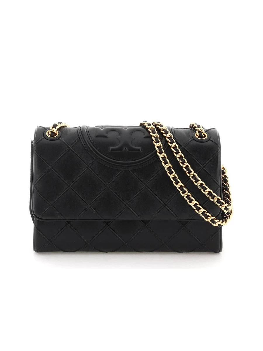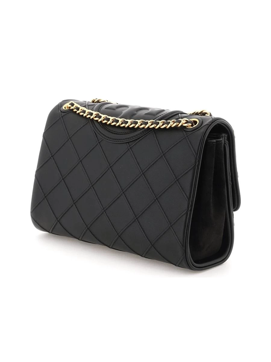 Crafted from supple nappa lambskin with an ever-classic diamond quilted finish, this Fleming Soft shoulder bag by Tory Burch is elegance personified. With suede leather sides and a statement embossed Double T logo, the design features a versatile leather-woven chain strap allowing it to grace the shoulder or be worn crossbody. Its interior is thoughtfully organised into multiple compartments, underpinned by the refined touch of gold-finished metalware.