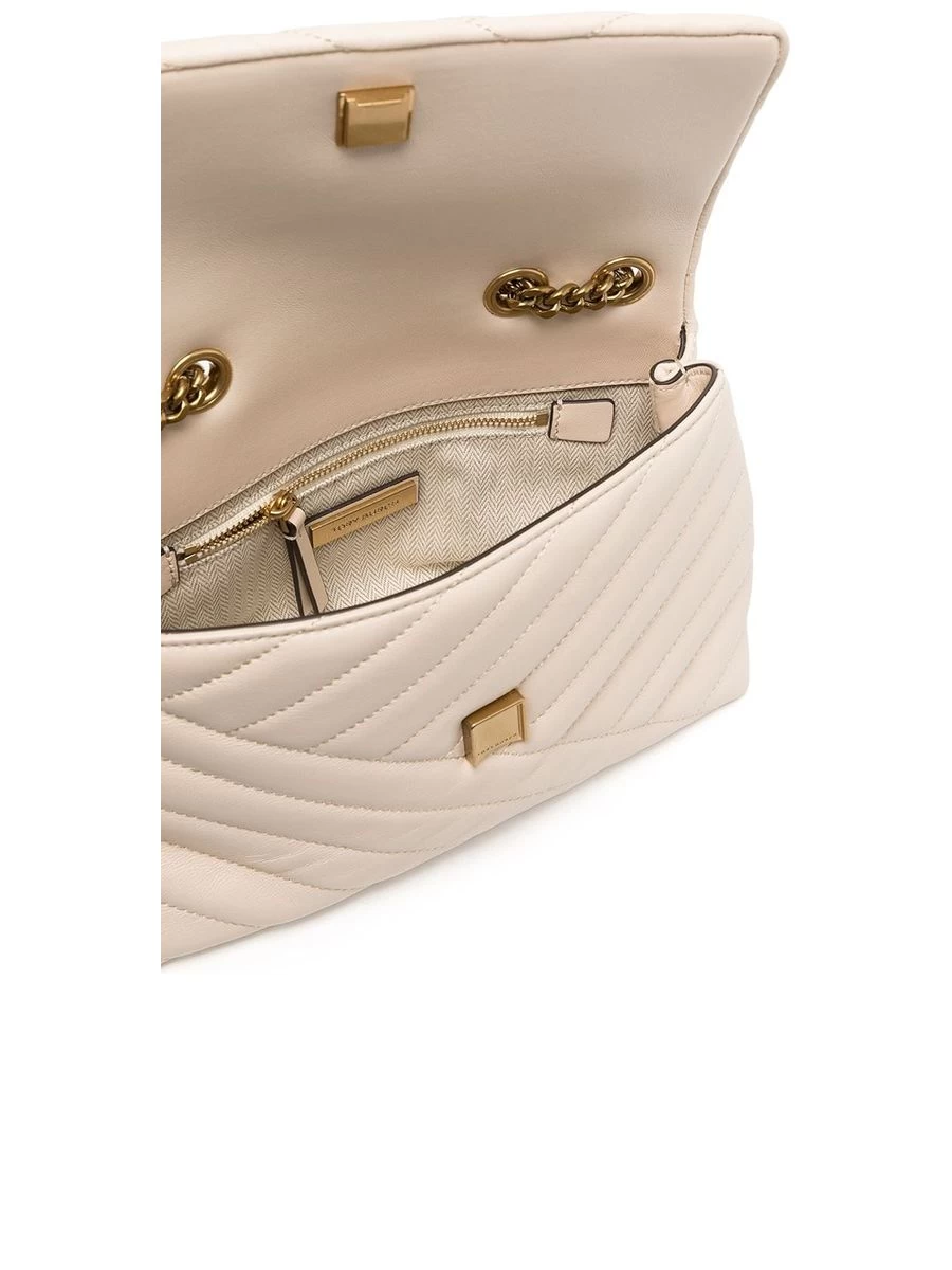 Delight in the classic elegance of the Kira shoulder bag, expertly crafted with chevron quilting. This chic bag boasts a convenient foldover top and is adorned with a tasteful chain-link shoulder strap, providing both comfort and style for the discerning carrier.