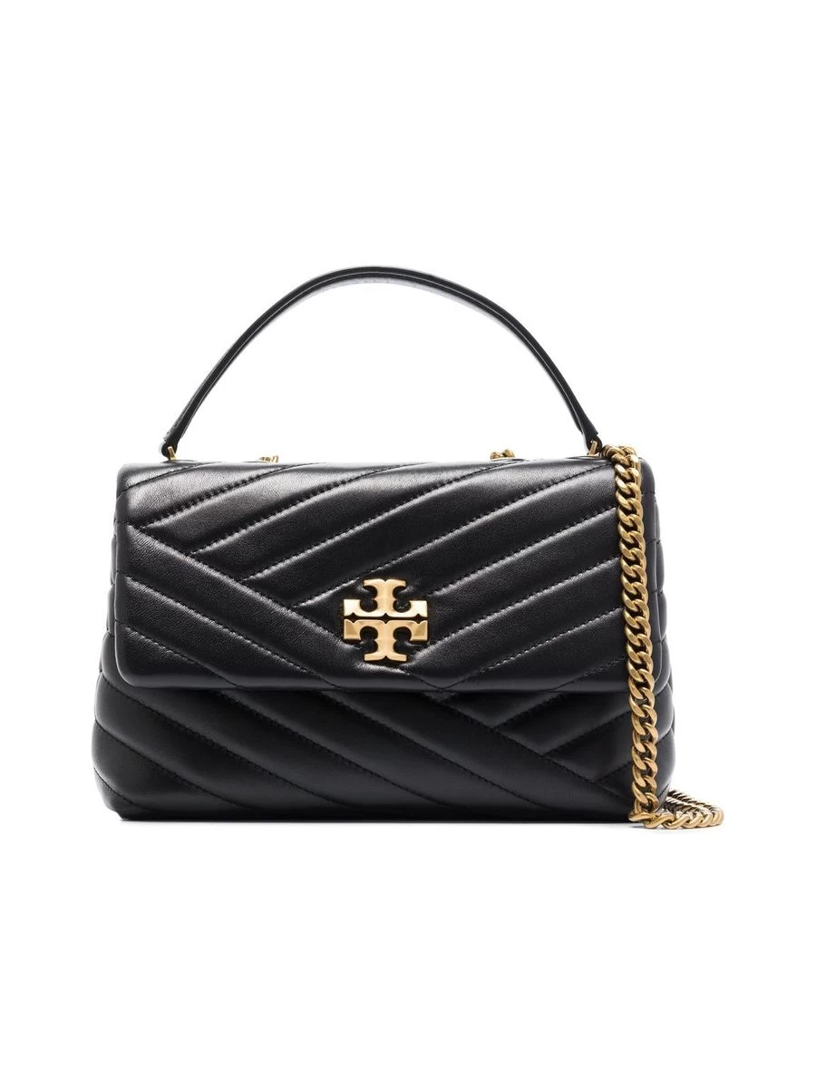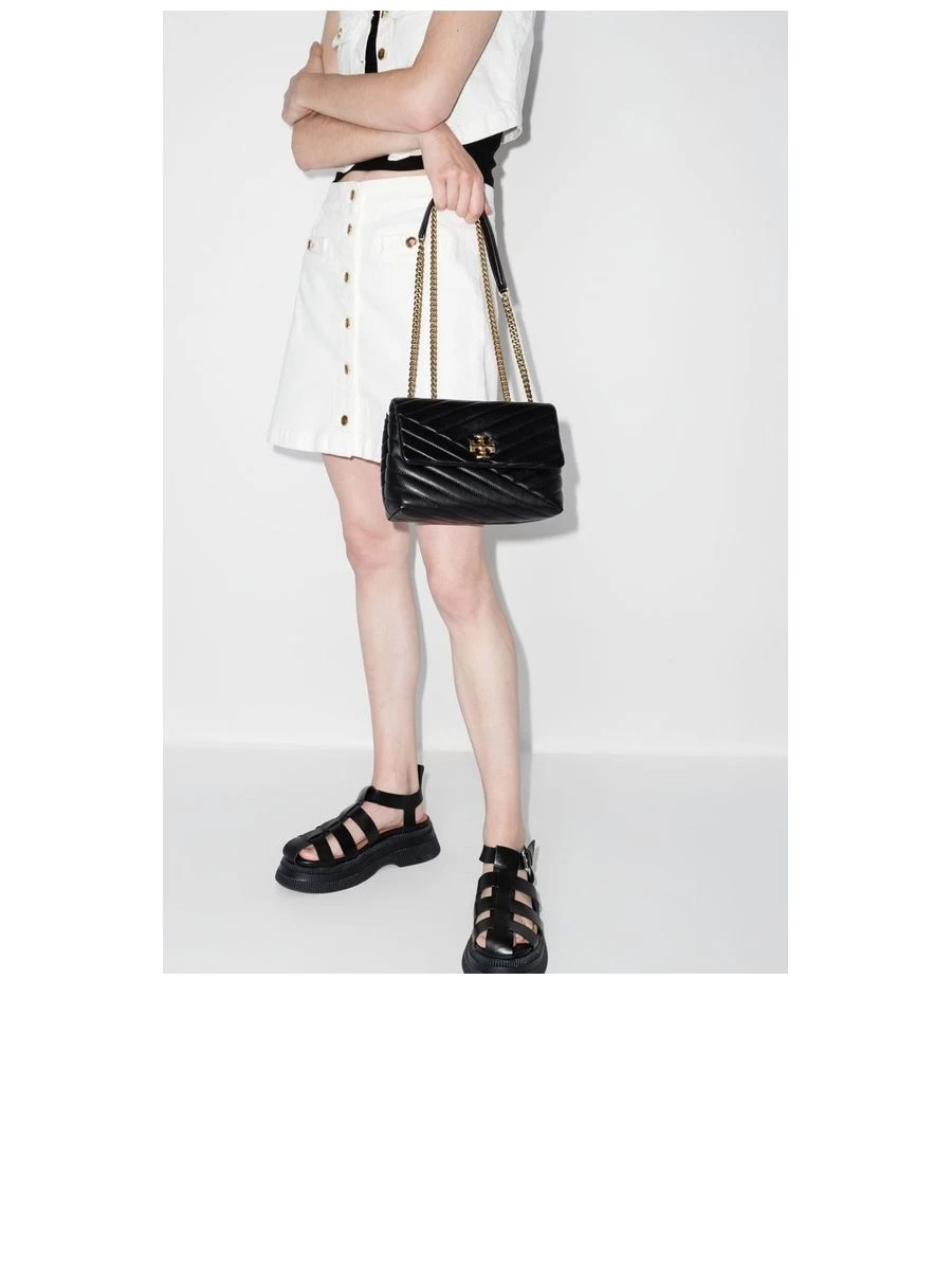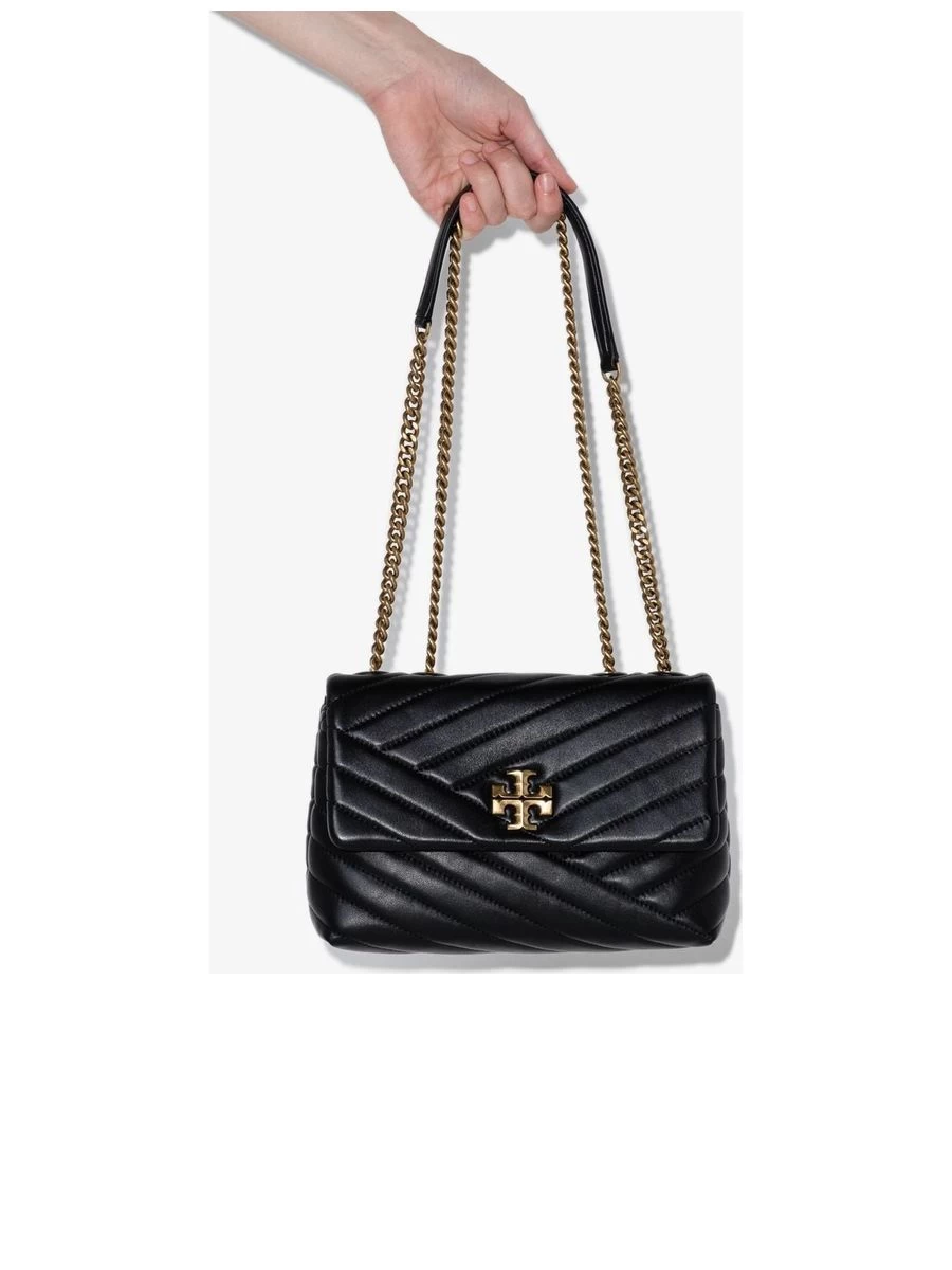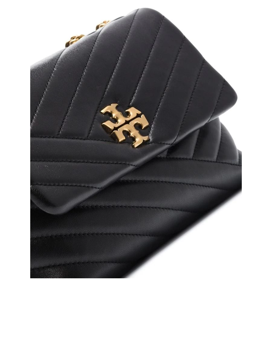 This Tory Burch piece is a stylish Kira shoulder bag with a sophisticated chevron-quilted design, neatly complemented by the iconic Double T motif. The bag combines practicality and elegance, featuring a foldover top leading to a well-organized main compartment with an internal zip-fastening pocket, finished with lustrous gold-tone hardware.