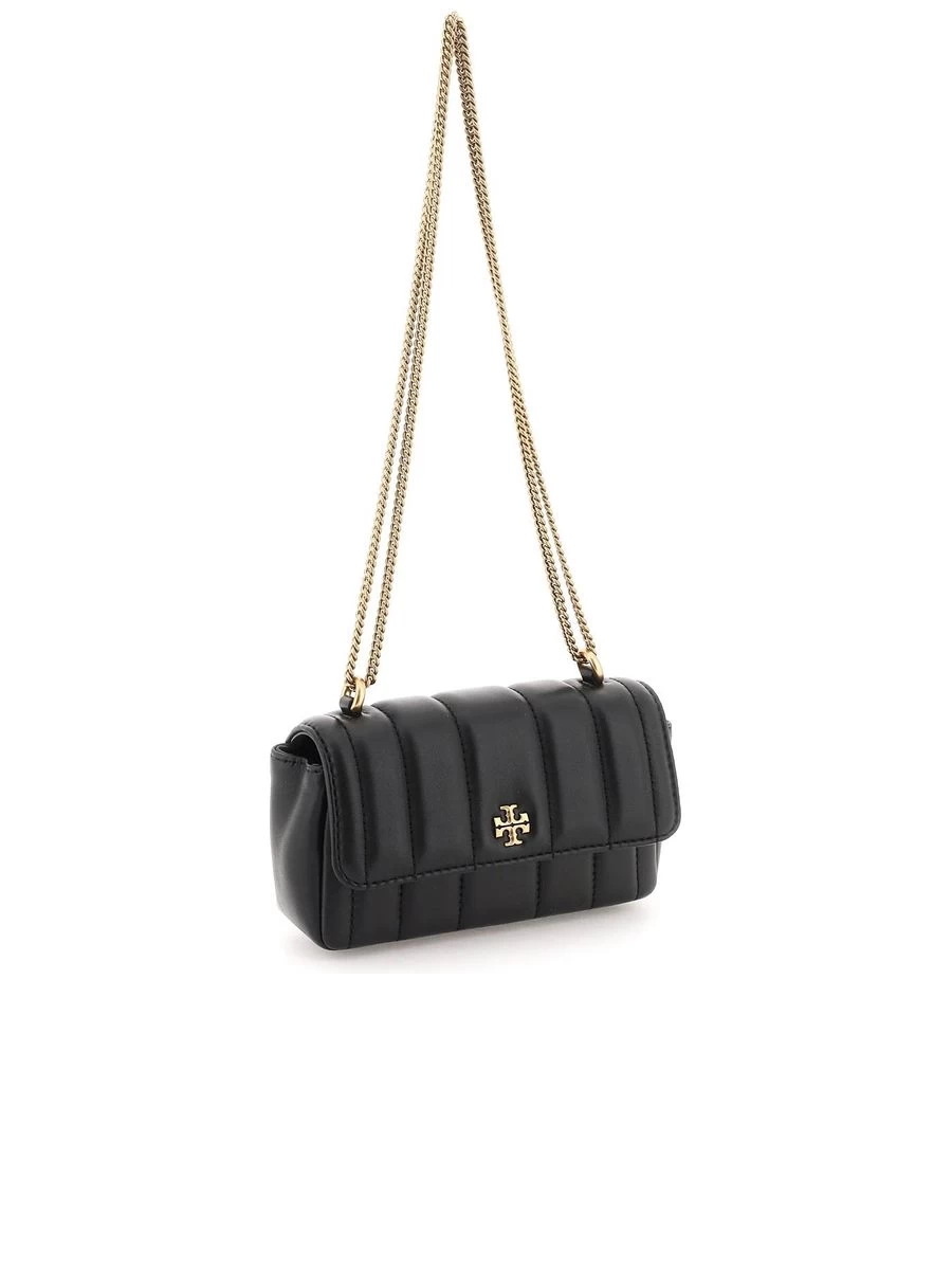 Experience the elegance of minimalism with the Tory Burch Kira Mini Bag. Exquisitely crafted from quilted nappa leather, this accessory boasts the iconic metal Double T logo for an unmistakable touch of luxury. The design features a versatile sliding chain strap, allowing for comfortable shoulder or crossbody wear. Secured with a magnetic closure, the interior reveals a soft suedette lining paired with a convenient leather credit card slot, all finished with lustrous gold-tone metalware.