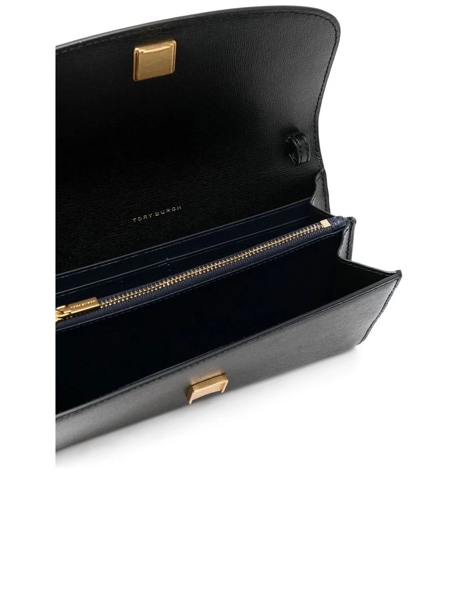Crafted from the finest calfskin with a lush grained texture, this elegant Tory Burch clutch presents a gold-tone logo plaque adding a dash of luxury. Its compact rectangle body unfolds to an accordion design, secured by a foldover top with magnetic closure. A detachable chain and leather strap offers versatile carrying options, while the inside houses an internal zip-fastening pocket alongside handy card slots.