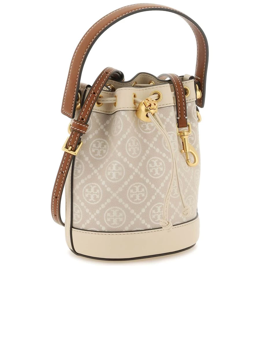 Elevate your accessory game with our T Monogram Mini Bucket Bag. This piece boasts an indulgent jacquard fabric adorned with an iconic logo, tastefully reflecting classic quilt patterning. The design is complemented by sumptuous leather trims and a sturdy base, crafted for both style and durability. It features a contrasting handle and a detachable adjustable shoulder strap for versatile carrying options. Secure your belongings with the elegant leather drawstring closure, finished with a monogram cord lock. Understated gold-finish brass hardware ties the look together, positioned on a base proudly bearing a large embossed logo.