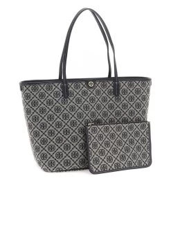 Indulge in the elegance of this Tory Burch tote, featuring the signature Monogram T motif for a touch of iconic styling. Crafted with a practical zipper closure, its microfiber suede interior houses a convenient zipper pocket and an accompanying removable pouch, all complemented by striking gold-finished metalware.