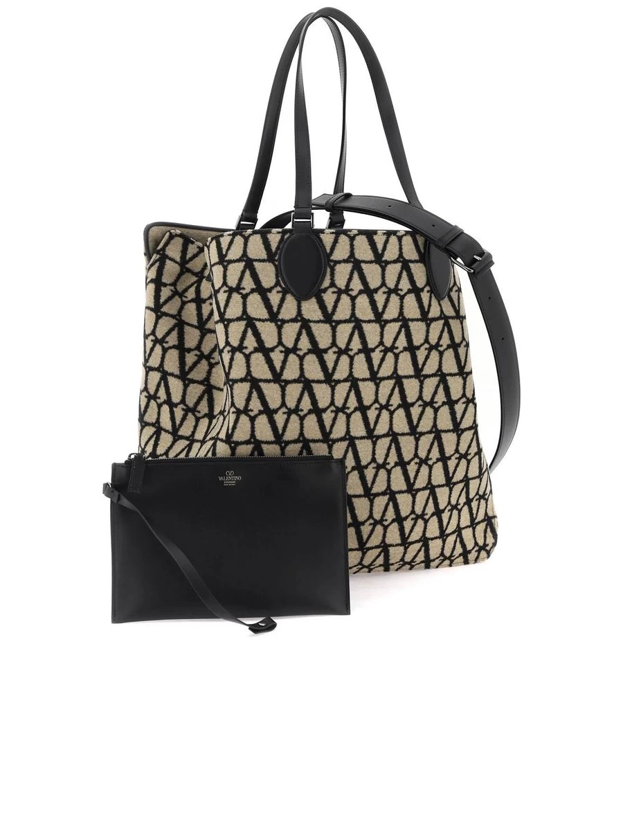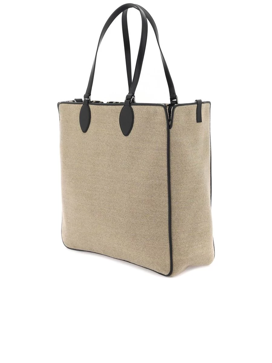 A distinguished reversible tote that epitomises versatility and style. Crafted with precision, this tote boasts a wool composition and features a prominent embroidered lettering logo on one facet and a striking Toile Iconographe motif on the reverse. Exuding practical luxury, it comes with durable leather handles, sleek trim, a secure lobster clasp closure, and includes a removable interior pouch. For added flexibility, there’s an adjustable, detachable shoulder strap finished with elegant ruthenium metalware.