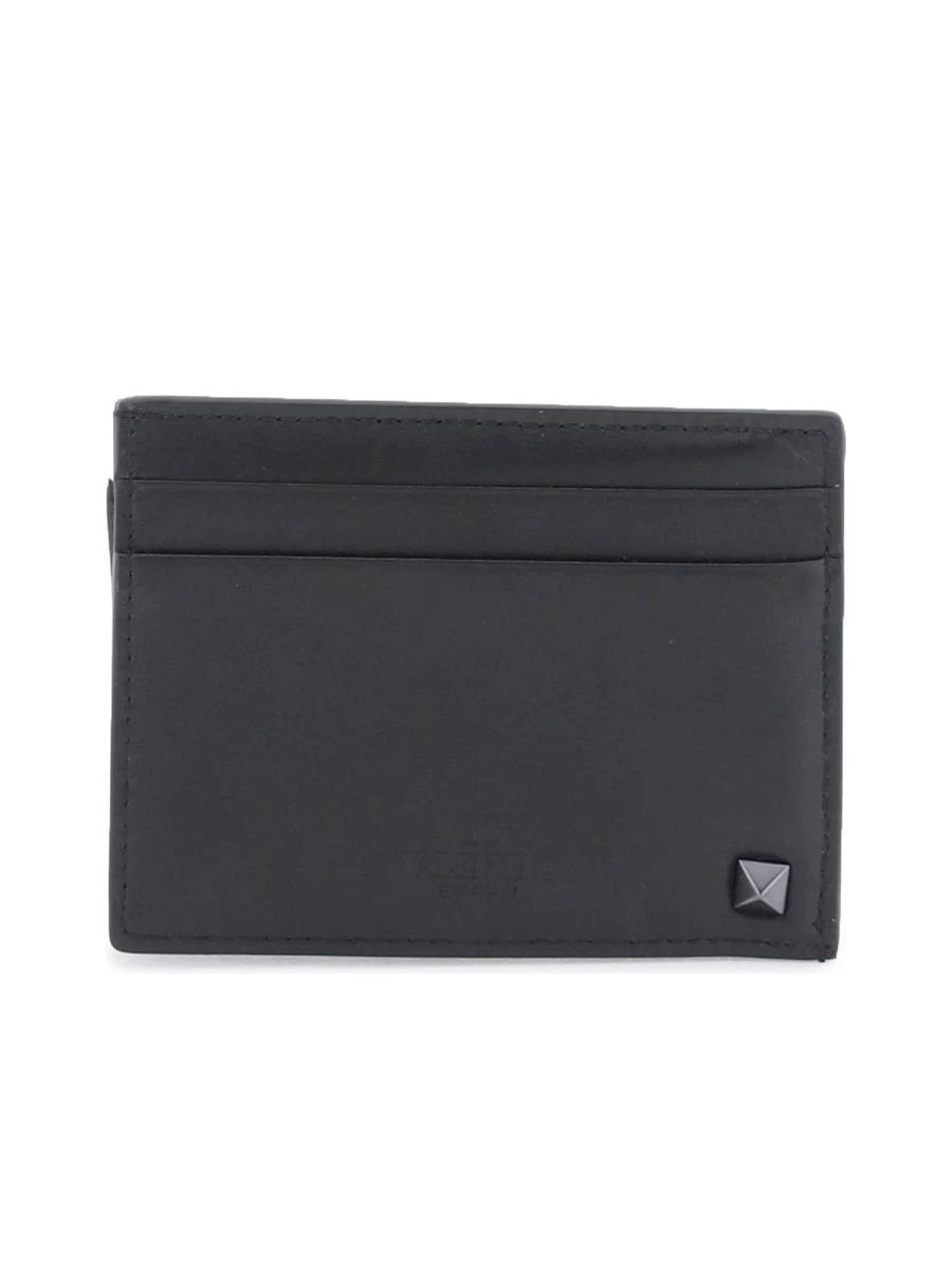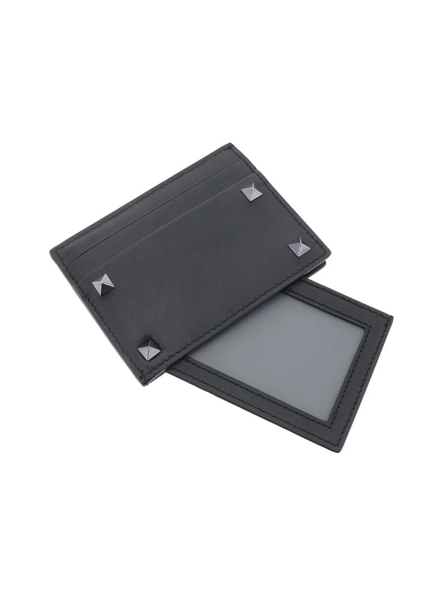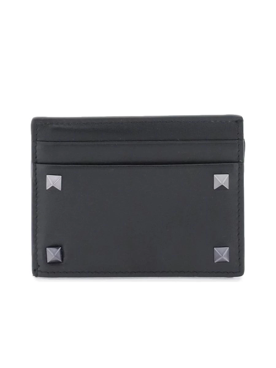 Embrace the exquisite touch of Valentino with the Rockstud cardholder. This luxurious piece is crafted from premium calf leather and adorned with iconic, ruthenium-finished metal studs that add a dash of rebel elegance. Its practical design features dual card pockets on both sides and an additional pull-out compartment, making it both a statement accessory and a functional item for everyday sophistication.