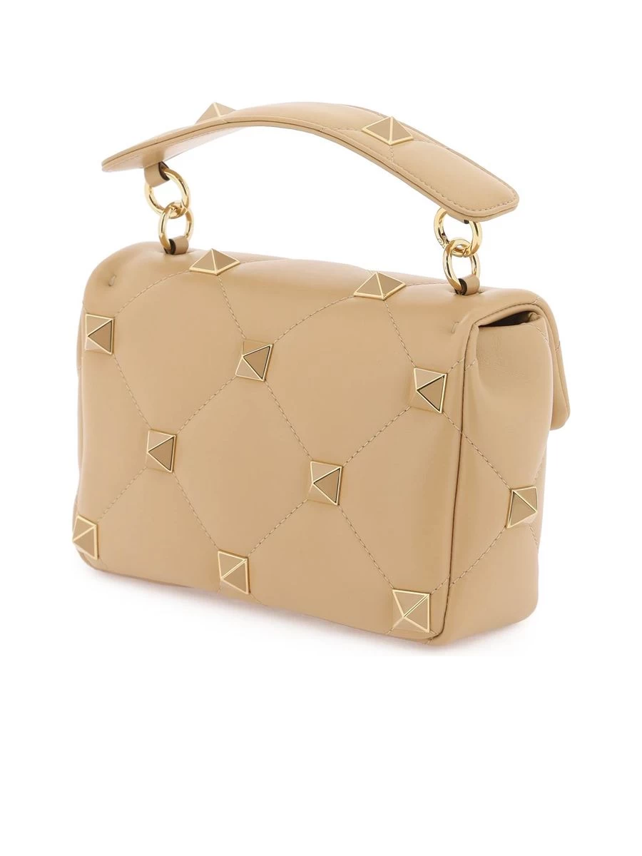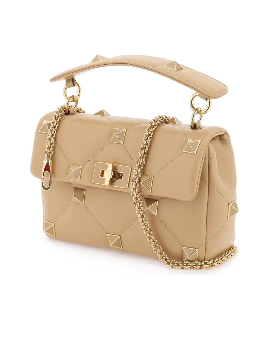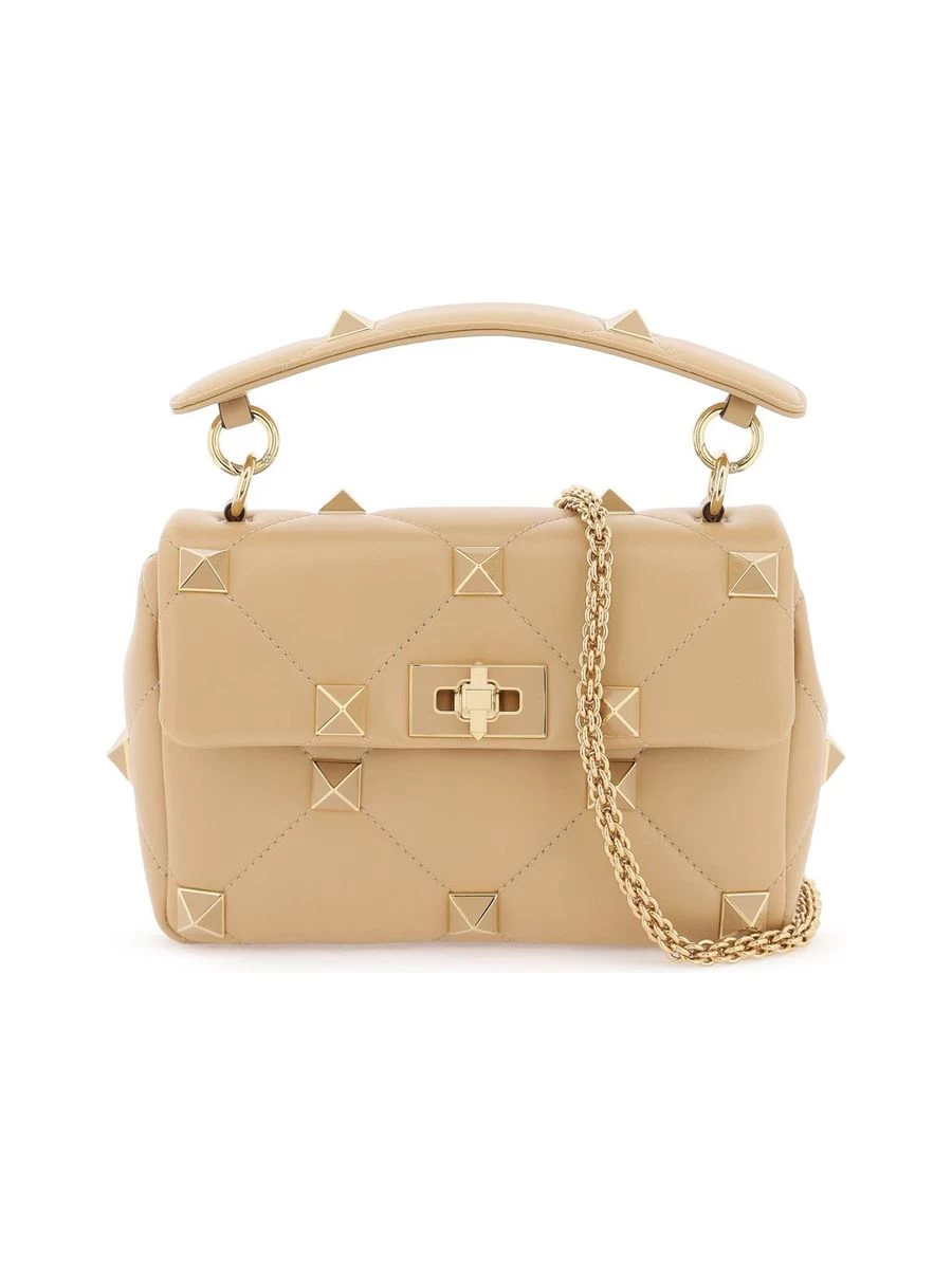 Indulge in the elegance of the Roman Stud, a medium-sized shoulder bag designed for the fashion-savvy individual. The quilted nappa leather adorns maxi, tonal studs for an enamelled gloss that captivates. Complete with a sliding chain strap and a twist-lock closure, the bag opens to a thoughtfully compartmentalised leather interior. This piece is a sophisticated addition to any wardrobe, crafted with precision in Italy.