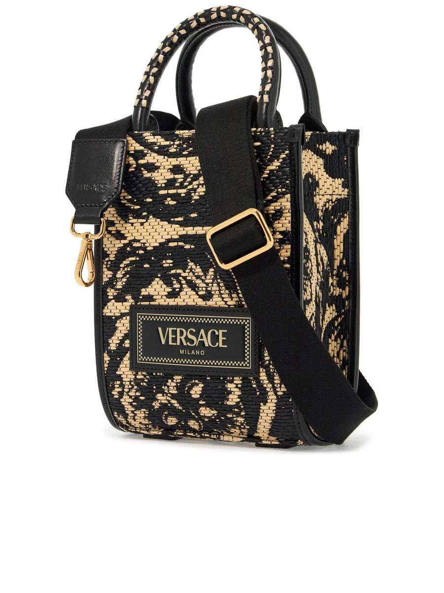 Crafted from intricately woven raffia in a jacquard Barocco pattern, this exquisite tote sports hand-stitched handles, along with a lined interior complemented by a versatile shoulder strap. Gold-finish metallic accessories imbue a touch of sophistication.