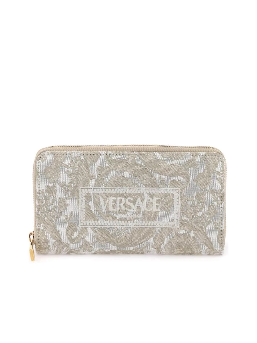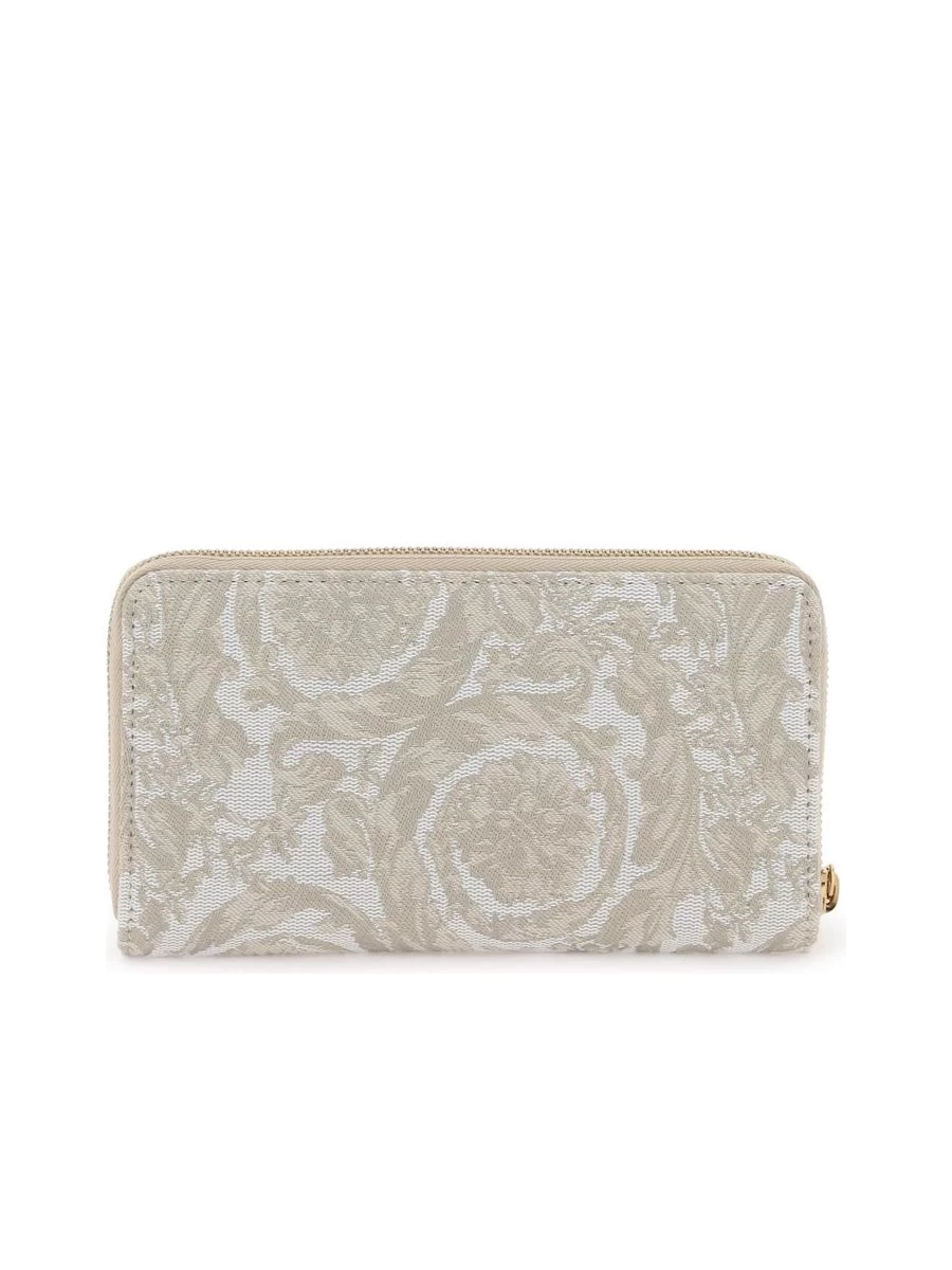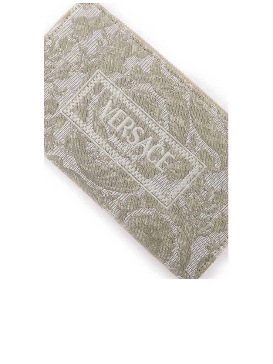 Embrace elegance and sophistication with this jacquard canvas wallet, showcasing the timeless Barocco motif and an embroidered 90’s Vintage Logo, all neatly secured with a zip-around closure. Its leather interior is thoughtfully designed with ample space for your essentials, including two bill compartments, a generous twelve card slots, and a concealed coin pocket, each accented with gold-finished metalware for a touch of luxe.