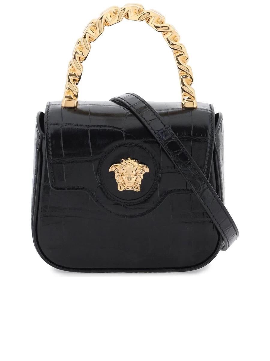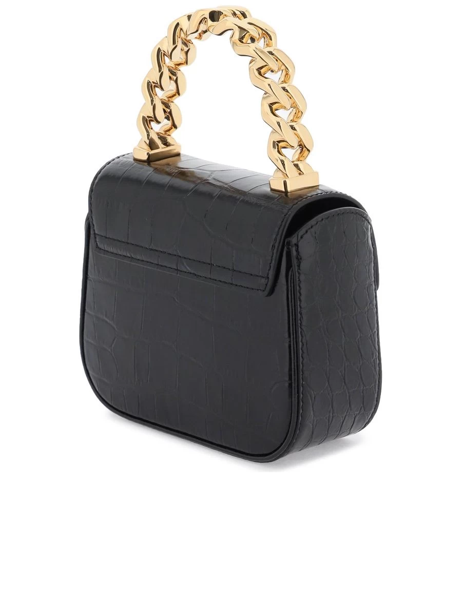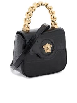 Indulge in a touch of luxury with this exquisite mini bag, showcasing a croco-embossed leather construction. The design features a statement rigid chain handle and the iconic gold-tone Medusa head that adds an opulent flair. The interior is lined with sumptuous nappa leather and fitted with three convenient card slots, all secured by a magnetic closure. A detachable and adjustable strap allows for versatile styling options, making this sophisticated piece a must-have for any fashion connoisseur.