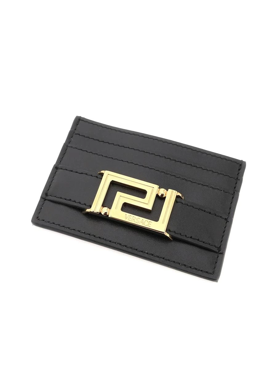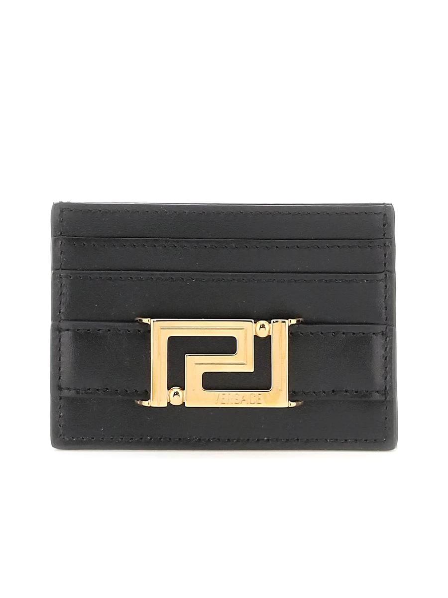 Carry your essentials in style with this elegant cardholder, featuring iconic Versace Greca Goddess emblem in shining gold metal. Crafted in Italy, the design includes convenient slots for easy organization of your cards, making it an ideal accessory for the discerning individual on the go.