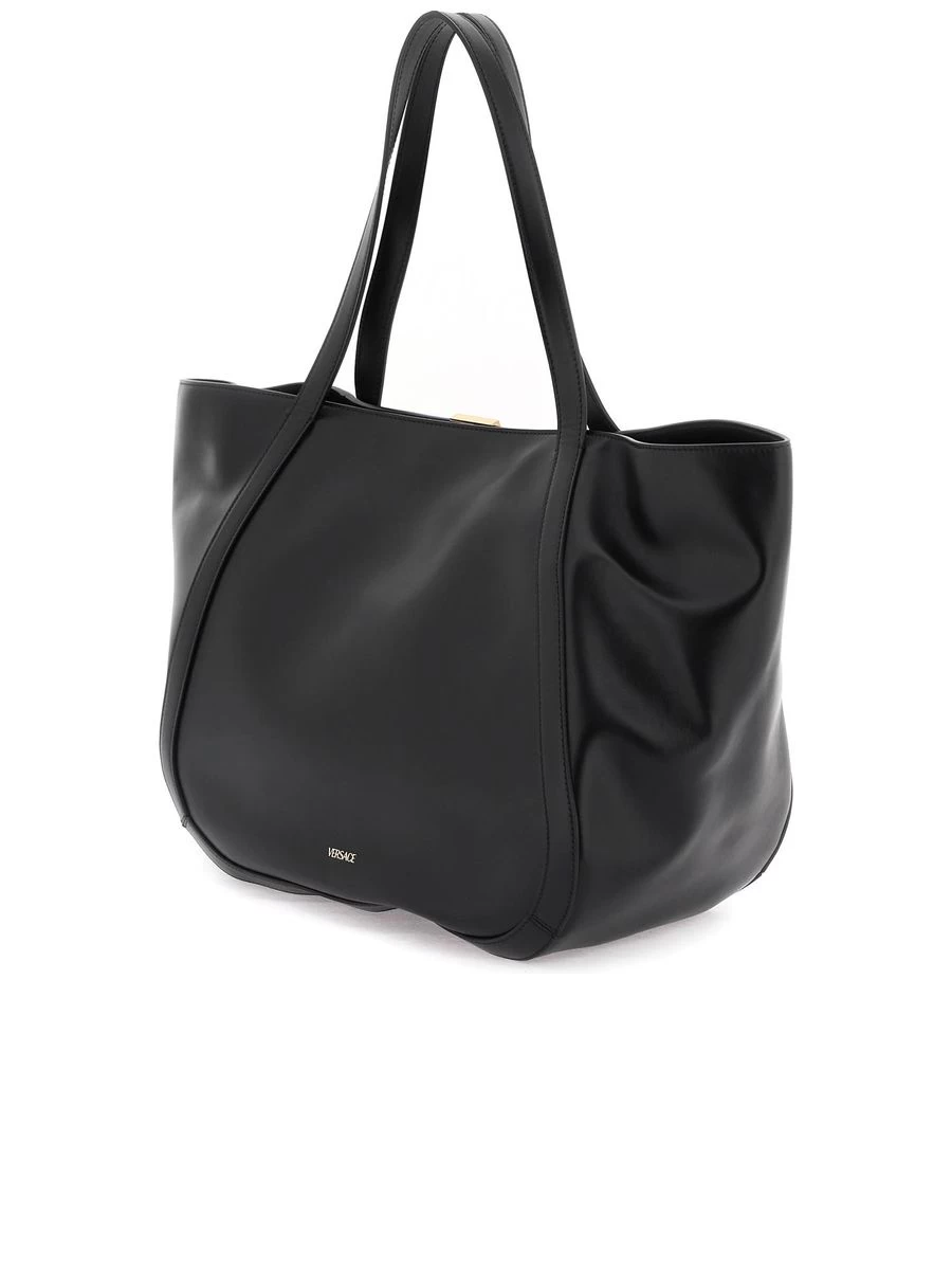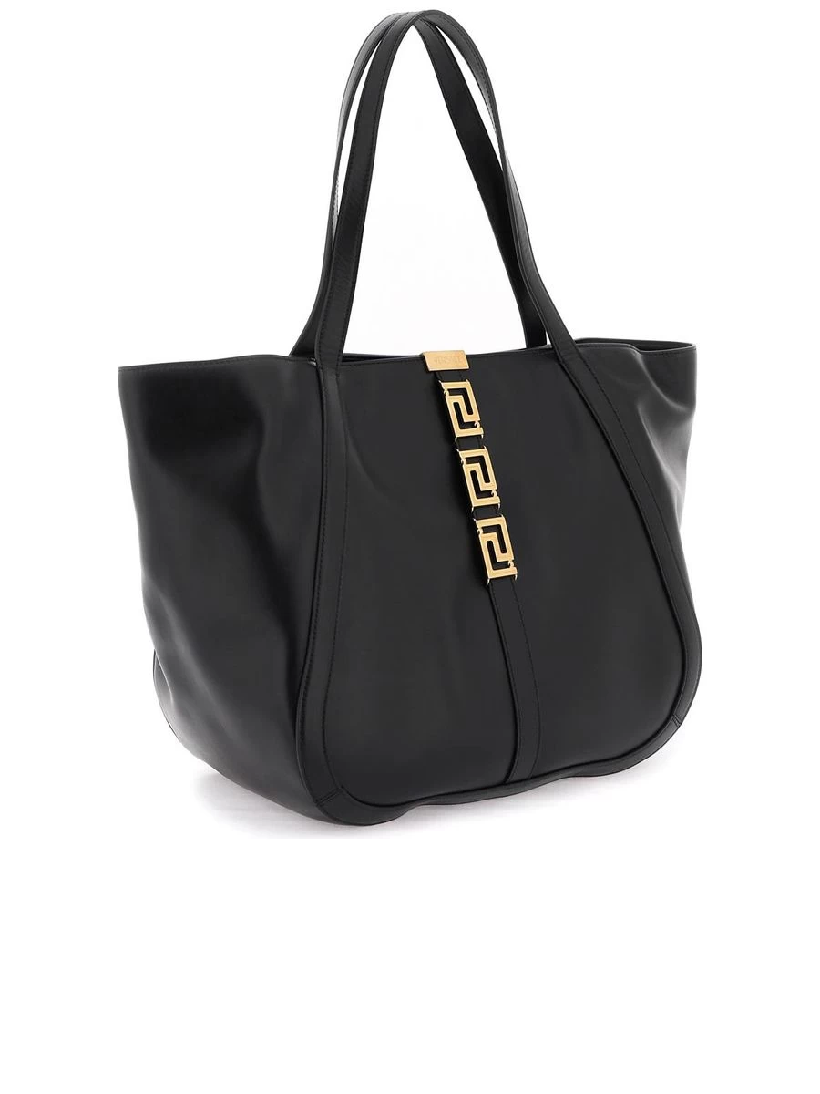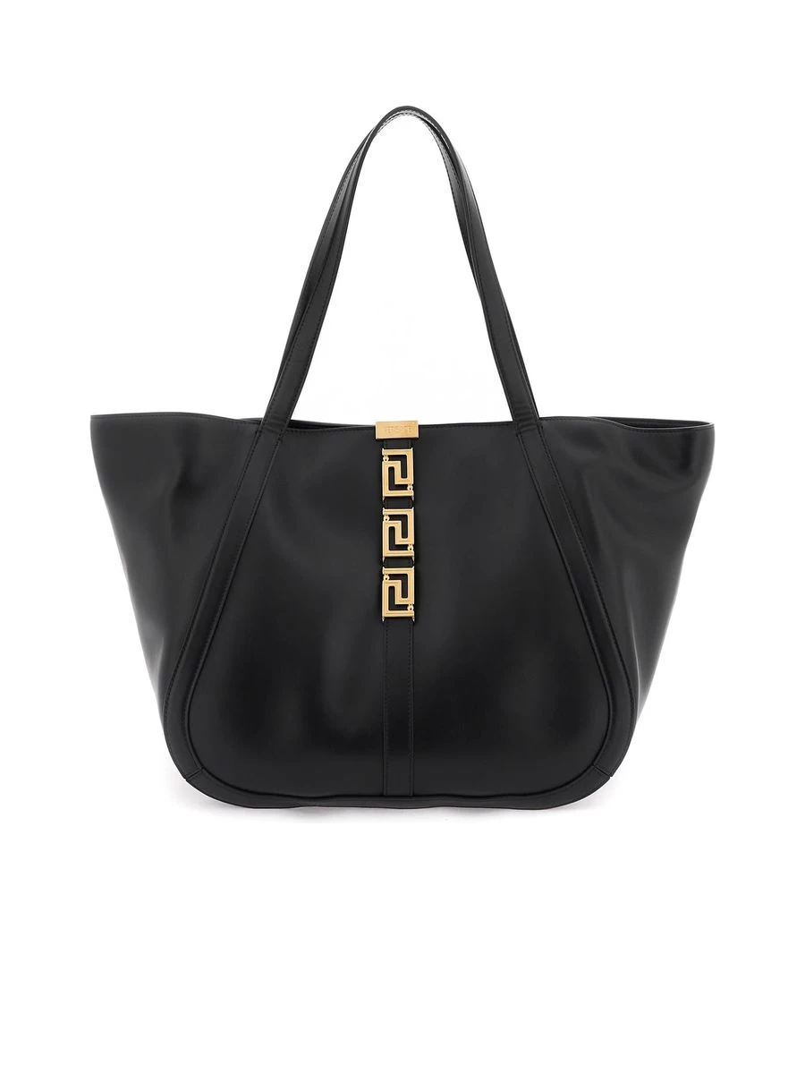 Immerse yourself in the epitome of luxury with this sophisticated leather tote bag. Adorned with iconic gold metal Greca detailing and a signature brand plaque, this elegant accessory ensures your belongings are secured with a magnetic closure. The cotton-lined interior, complete with a zippered pocket, adds a touch of practicality to the refined craftsmanship.